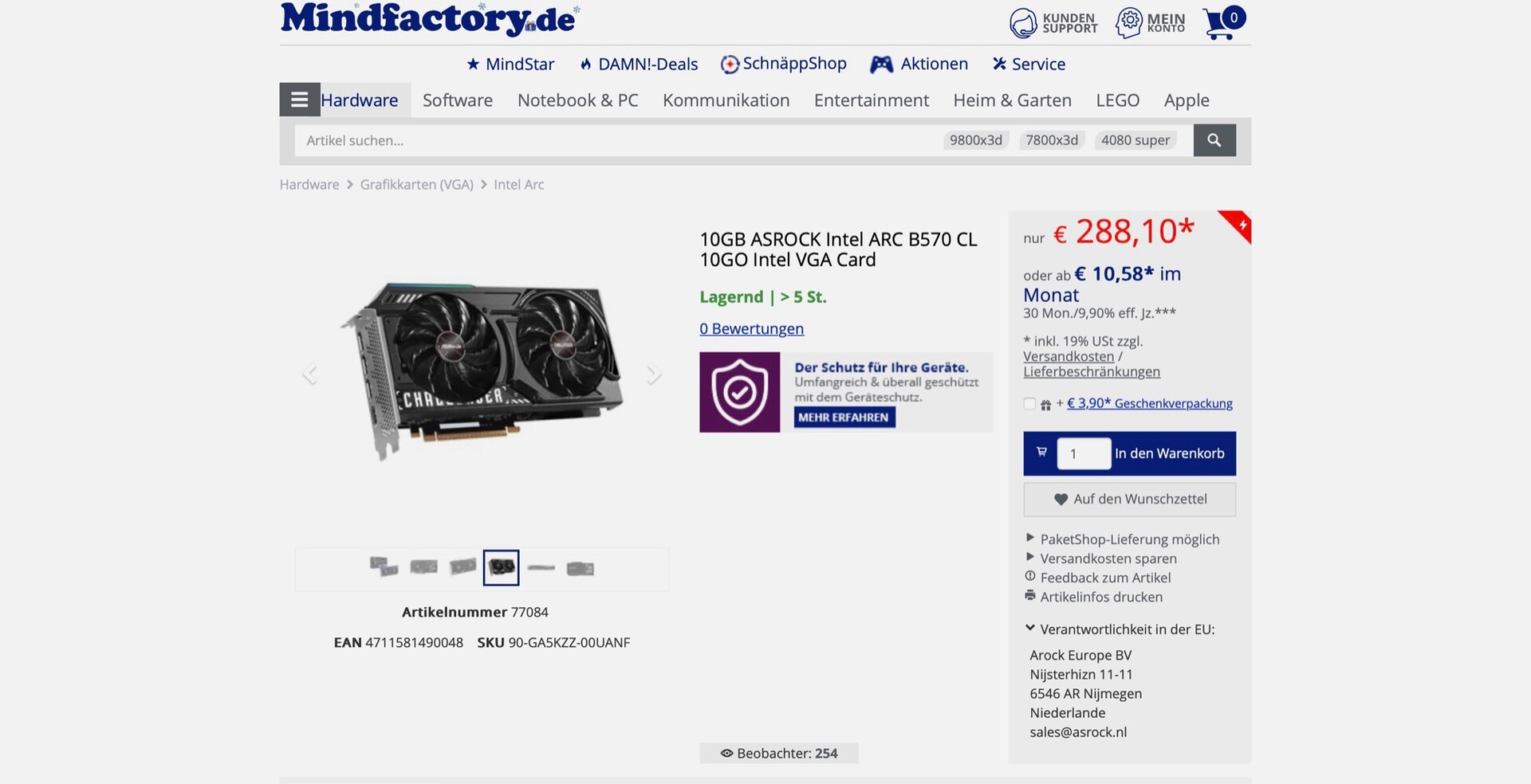 Bei der Ankündigung hieß es, die Grafikkarte kommt voraussichtlich am 16. Januar 2025 auf den Markt, und das für eine unverbindliche Preisempfehlung von 219 US-Dollar, wobei die UVP wie üblich nur für Intels "Limited Edition" gilt. Nun hat Mindfactory eine erste Variante der Arc B570 bereits auf Lager, nämlich eine ASRock Arc B570 CL 10 GB, und auch Mylemon will die Grafikkarte innerhalb von drei Tagen liefern können.
