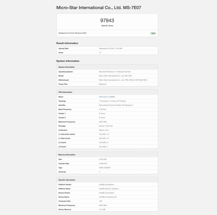 Ein neuer Geekbench OpenCL-Eintrag zeigt die Grafik-Performance eines Desktop-Computers von MSI, der mit einem Intel Core i5-13600K, mit 32 GB Arbeitsspeicher und mit einer neuen "Intel Xe Graphics RI" ausgestattet ist. Dabei sollte es sich um eine Arc Battlemage Grafikkarte der nächsten Generation handeln, die mit 160 Compute Units, also mit 20 Xe2-Kernen, ausgestattet ist. Zum Vergleich: Die in Intel Lunar Lake integrierte Intel Arc 140V besitzt 8 Xe2-Kerne.