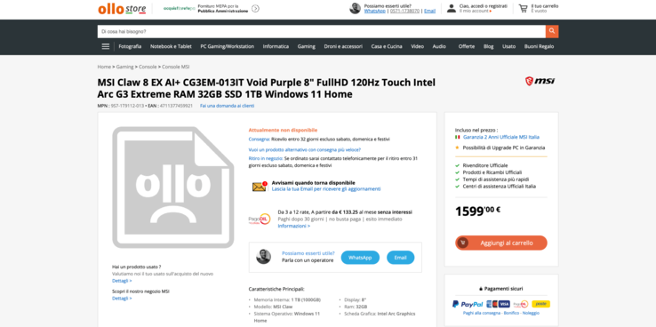 Das aktuelle MSI Claw 8 AI+ (ca. 1.140 Euro auf Amazon) nutz den Intel Core Ultra 7 258V Lunar-Lake-Chip samt integrierter Intel Arc 140V iGPU. Mit dem MSI Claw 8 EX AI+ kommt offenbar schon bald ein neues Modell auf den Markt, das den bisher noch nicht erhältlichen Intel Arc G3 Extreme nutzt. Denn dieser Gaming-Handheld wird bereits beim italienischen Onlineshop Ollo.it gelistet.