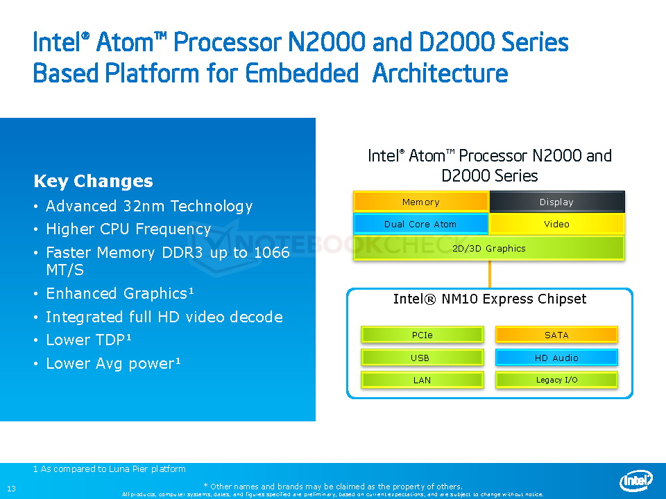 Auf der technischen Seite sind alle wichtigen Details zu den Intel Prozessoren Atom N2600 und Atom N2800 für Netbooks bekannt. Der Intel Atom N2600 taktet mit 2x 1,60 GHz, die integrierte Grafikeinheit mit 400 MHz. Als TDP nennt Intel für den N2600 sparsame 3,5 Watt. Der Atom N2800 taktet mit 2x 1,86 GHz. Die TDP liegt bei 6,5 Watt und die Grafik läuft mit 640 MHz. Weitere Details zu Cedar Trail finden sie in den unten angefügten Links und Slides.