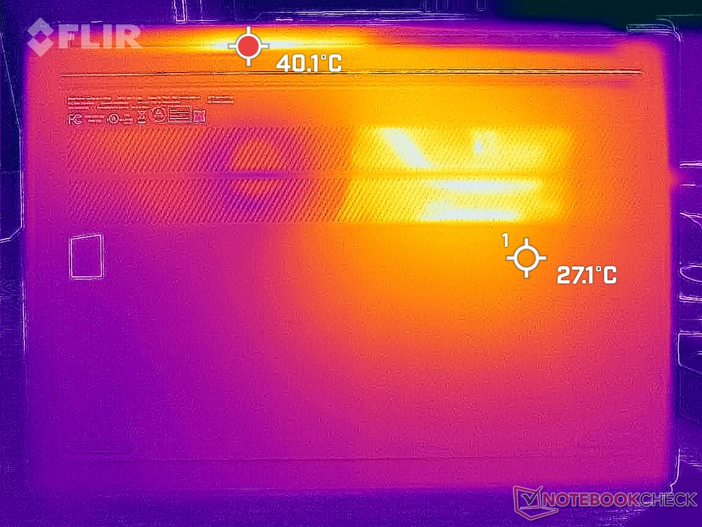 Die Oberflächentemperaturen sind auf der linken Hälfte des Gehäuse wärmer, wo Hotspots auf den WASD-Tasten über 35 °C erreichen können. Der 16-Zoll-Formfaktor gilt als groß für eine CPU der U-Serie, und daher sind die Oberflächentemperaturen auch unter Last relativ kühl. Das Inspiron 16 7640 2-in-1 mit der schnelleren H-Serien-CPU zum Beispiel erreicht unter ähnlichen Bedingungen über 45 °C und ist damit während der Nutzung spürbar wärmer.