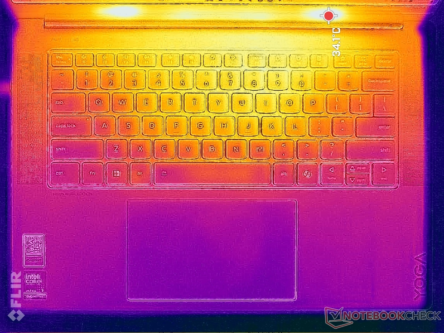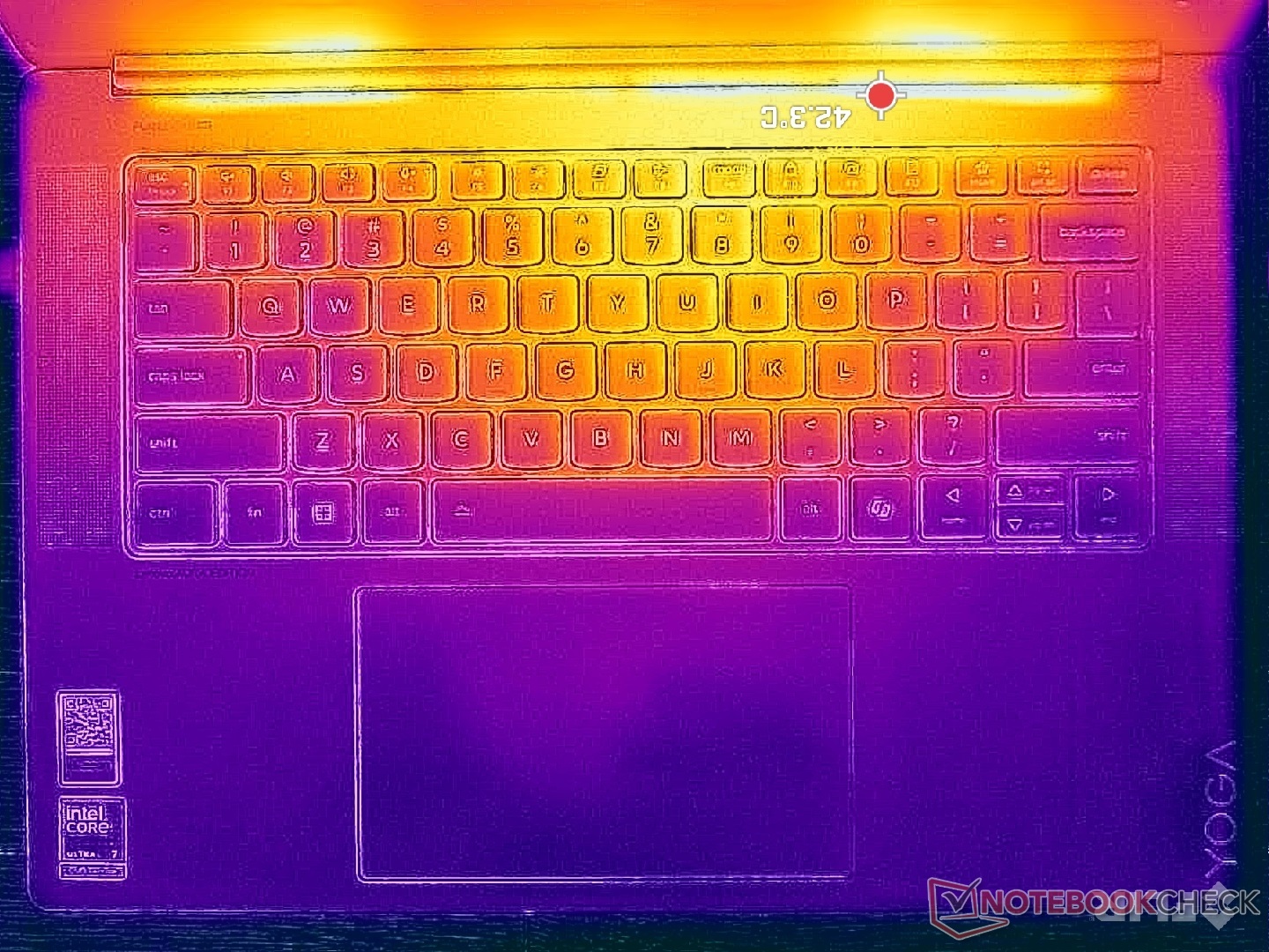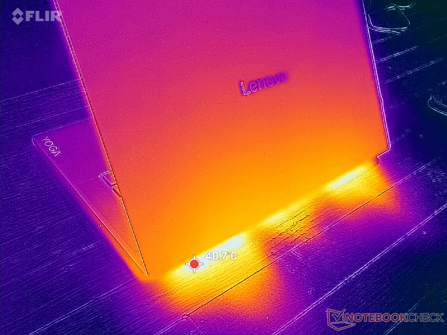 Die Oberflächentemperaturen entwickeln sich symmetrisch, wobei sich die heißen Stellen in der hinteren Mitte des Gehäuses befinden. Diese Bereiche können beim Spielen bis zu 41 °C erreichen oder bei längerer voller CPU-Auslastung sogar über 46 °C steigen. Die Ergebnisse unterscheiden sich nicht wesentlich von denen des Snapdragon-betriebenen Asus VivoBook S 15, während das Yoga Slim 7 15 Aura im Durchschnitt kühler bleibt als das kleinere und leistungsstärkere XPS 14.