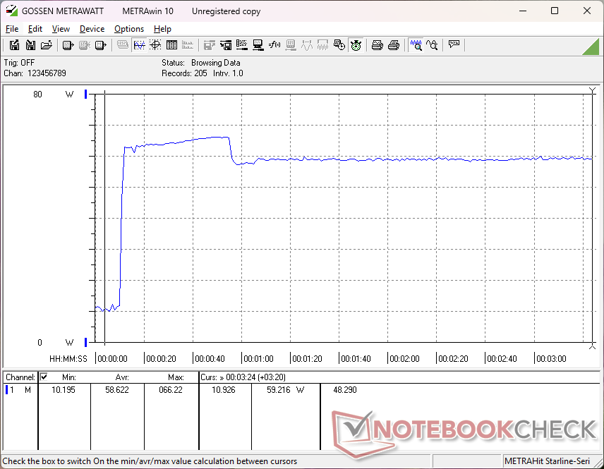 Bei höherer Last, wie zum Beispiel beim Spielen, werden etwa 49 W benötigt, wodurch es deutlich effizienter ist als Iris Xe-betriebene Laptops, aber immer noch hinter Radeon 890M-betriebenen Alternativen wie dem ZenBook S16 zurückbleibt.