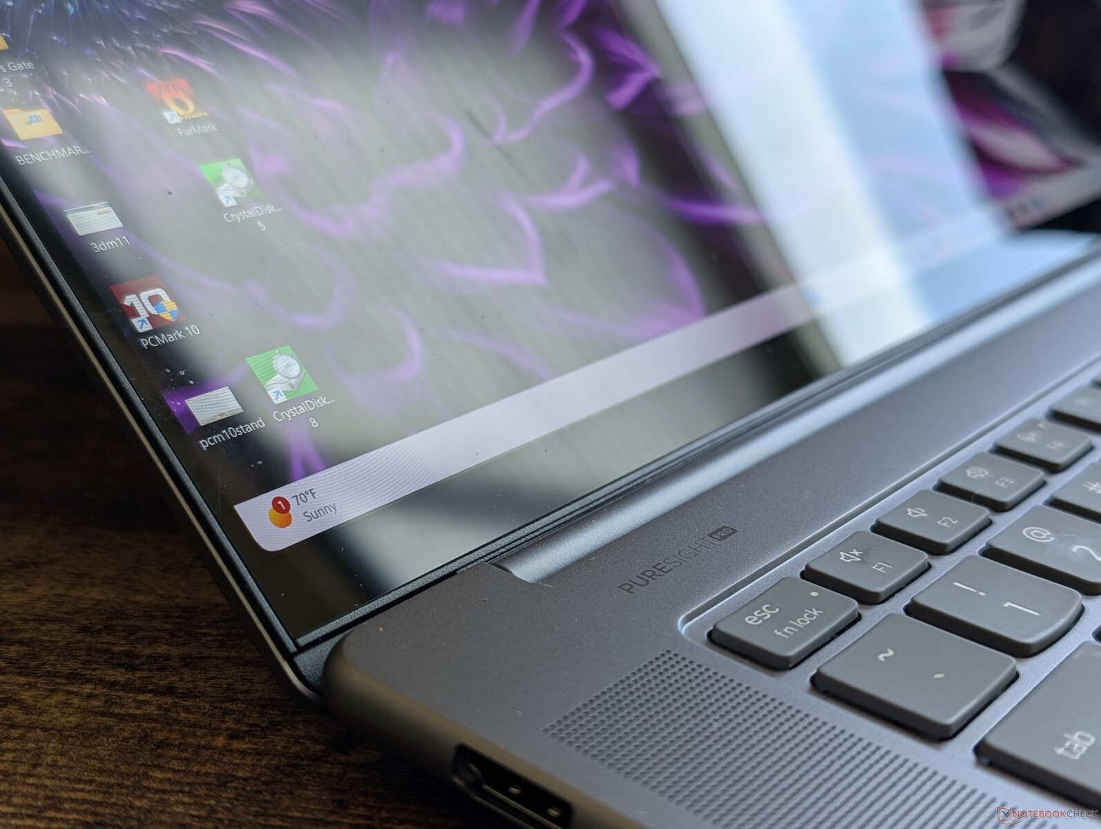Mit maximal 500 Nits ist das Display etwas heller als die Konkurrenten wie das Asus Vivobook S 15 oder das Spectre x360 16. Der Vorteil ist jedoch nicht groß genug, um einen spürbaren Unterschied im Freien zu machen, wo Blendungen immer noch unvermeidlich sind – besonders bei dem glänzenden Bildschirm. Die Sichtbarkeit ist bestenfalls im Schatten akzeptabel.