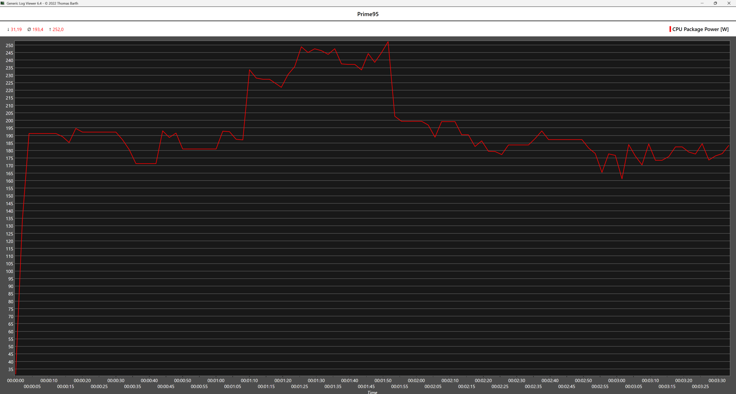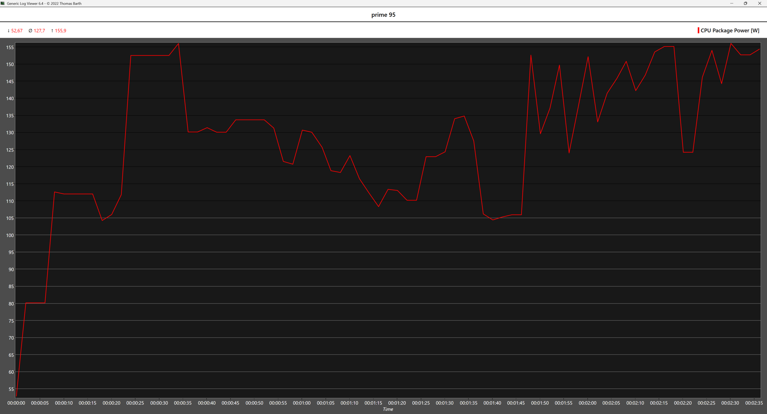 In Szenarien, in denen alle Kerne ausgelastet sind, wie beispielsweise beim Multi-Core-Stresstest von Cinebench 2024 oder dem Prime 95 Large FTT-Test, verbraucht die AMD-CPU selbst im Leistungsprofil „High Performance“ weniger Strom. In Prime 95 verbraucht die AMD-CPU im Durchschnitt 65 W weniger als die Intel-CPU, während die Intel-CPU in der ersten Minute des Tests in den thermischen Drosselungszustand übergeht und fast TJMAX erreicht, wobei die Temperaturen danach allmählich sinken. Diese Extremfälle sind in realen Szenarien jedoch eher unwahrscheinlich.