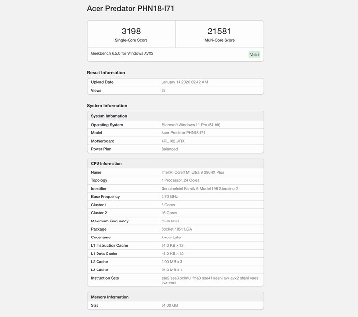 Mit einem Geekbench 6 Single-Thread-Resultat von 3.198 Punkten und einem Multi-Core-Ergebnis von 21.581 Punkten ist der Core Ultra 9 290HX Plus in diesem Benchmark-Durchlauf immerhin schon 5,6 Prozent respektive 4,6 Prozent schneller als der Core Ultra 9 285HX. Ein gewaltiger Performance-Sprung ist also nicht zu erwarten, was nicht überraschend ist, da die neuen Prozessoren auf dieselbe Architektur setzen wie schon die älteren Arrow-Lake-Chips.