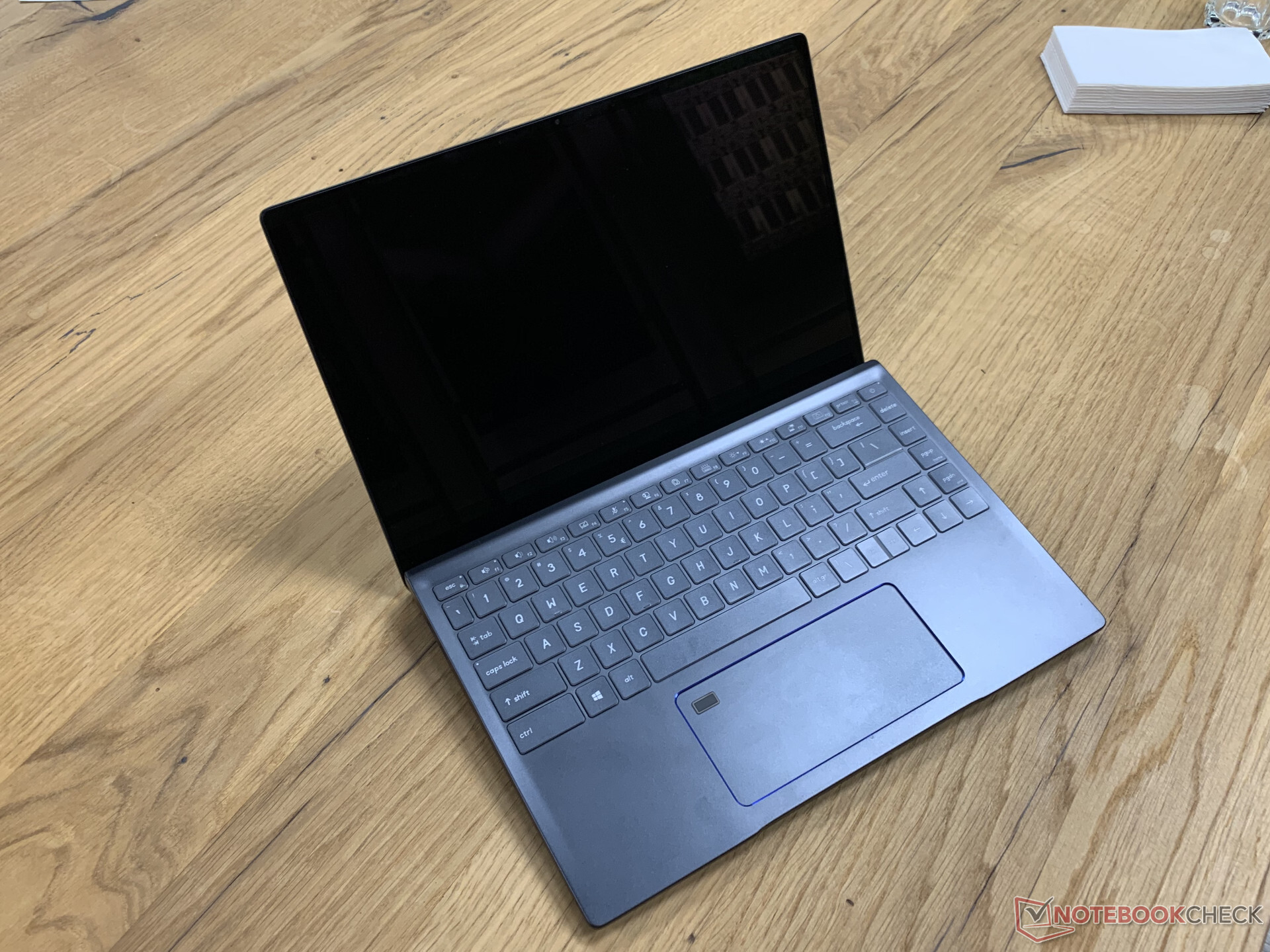 Für den Test stand uns ein "Intel Reference Design System" zur Verfügung, welches speziell für diesen Zweck gebaut wurde. Dieses basiert auf ein MSI Prestige 14 (im Test mit Comet Lake) Barebone-Notebook und wird so den Handel nicht erreichen. Es ist ein relativ dünnes 14-Zoll-Notebook, welches über das Display-Hinge angehoben wird und die Luft von unten ansaugt. Die Lüfter blieben während unserer Benchmarktests relativ gemäßigt. Das Alugehäuse erwärmte sich durchaus, blieb aber unauffällig. Leider dürfen wir vom Innenleben keine Fotos veröffentlichen.