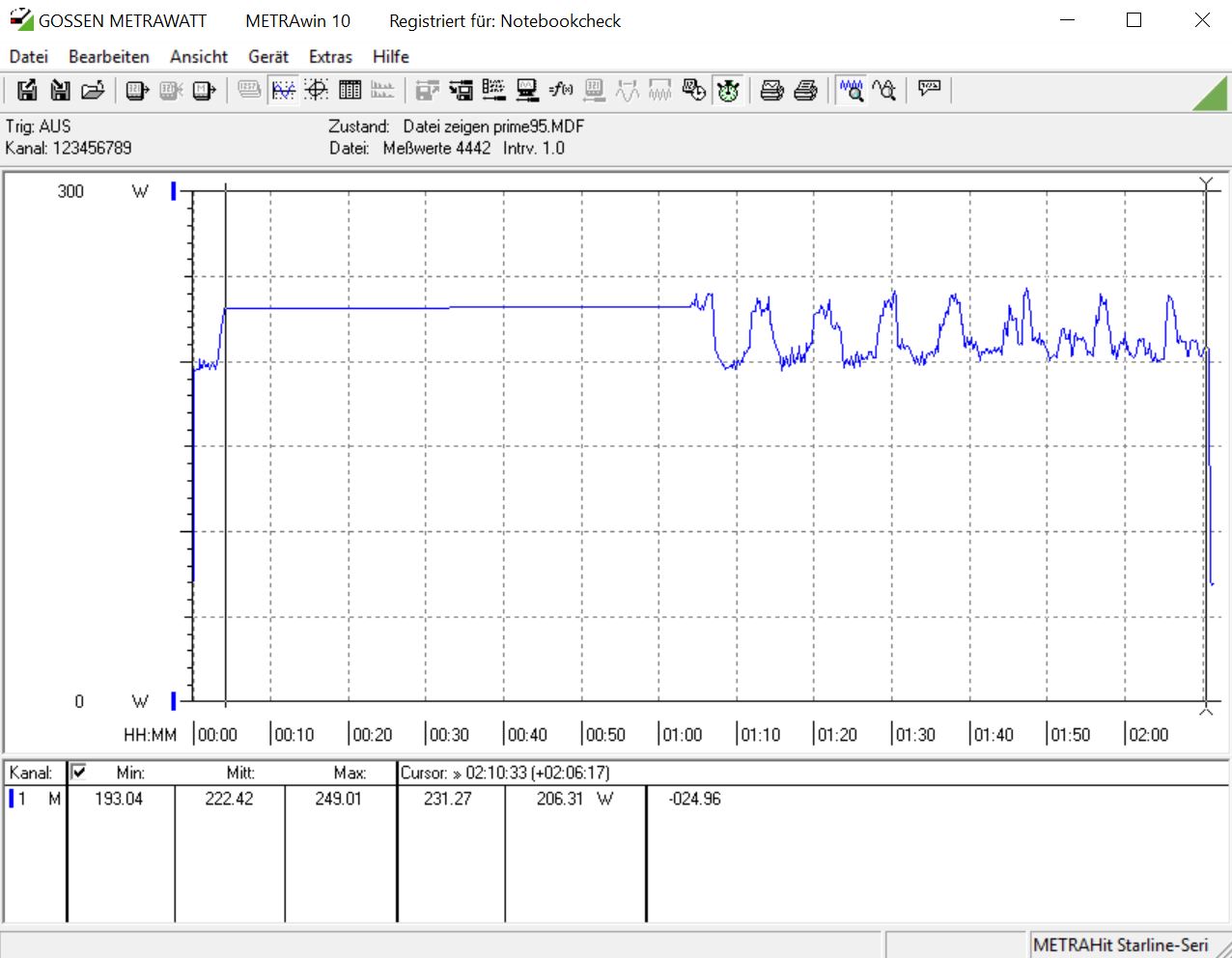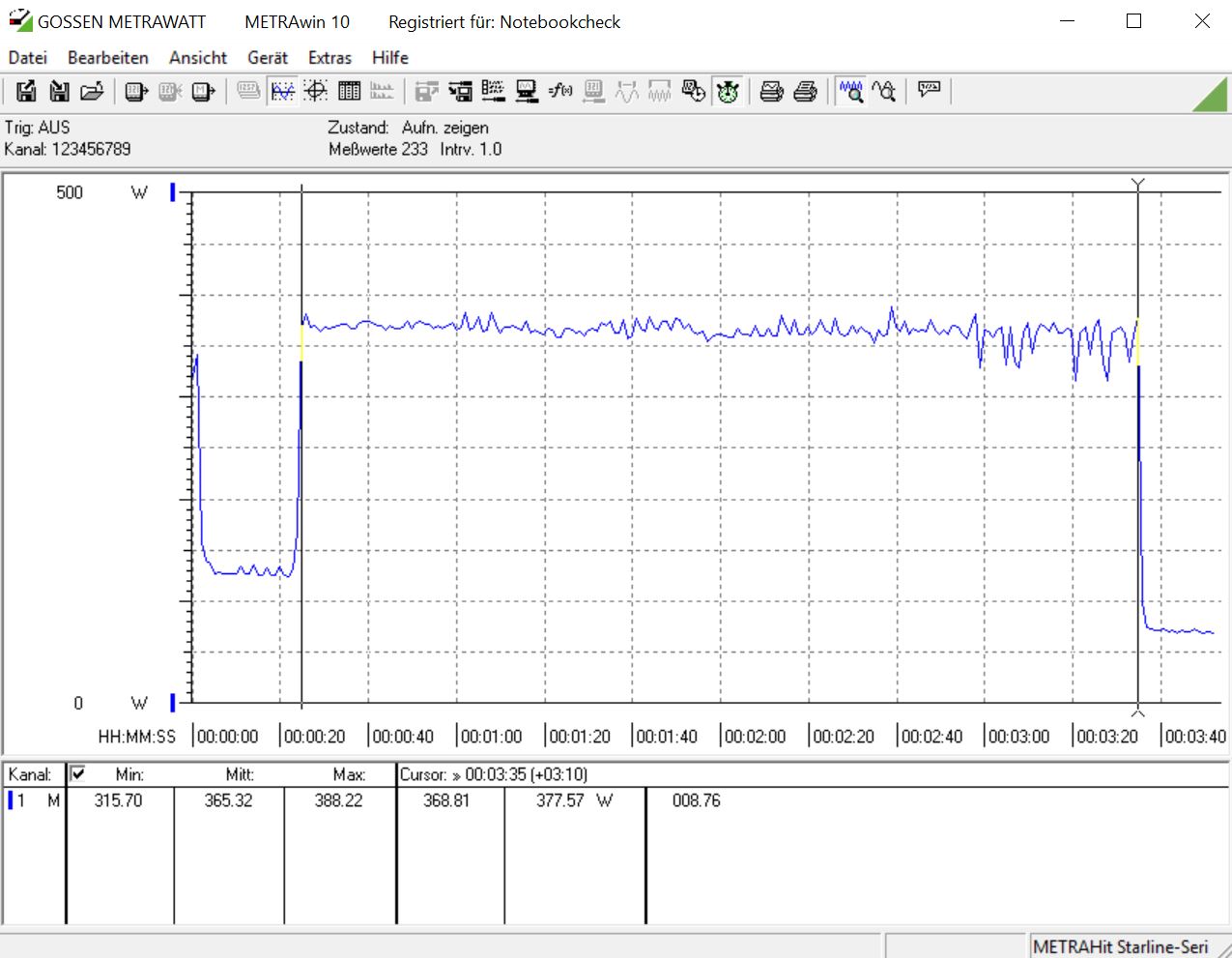 Die Leistungsaufnahme des Gesamtsystems lag im Schnitt bei 255 Watt während des Cinbench-R15-Multi-Testes. Das ist ein Zuwachs von gut 50 Watt im Vergleich zum Normalbetrieb.