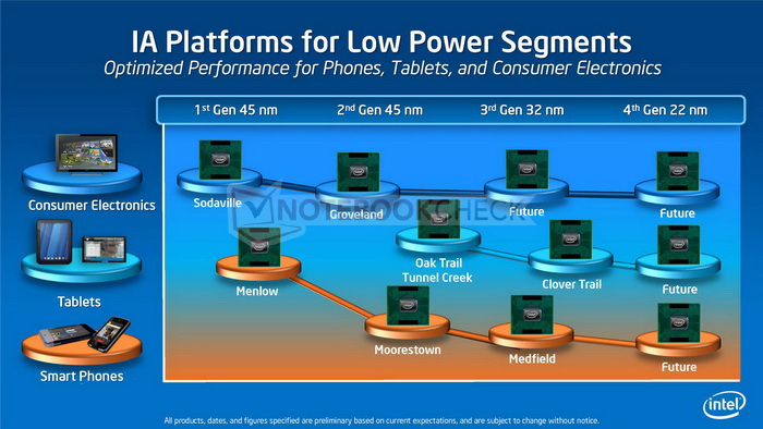 Intel favorisiert bei den Prozessoren für Windows-8-Tablets bis 11,6 Zoll einen Atom Z2760 SoC auf Basis der bereits erwähnten Atom-Plattform für Tablets und Hybrid-Rechner mit Codenamen Clover Trail. Mit seinem Atom Z2460 mit Codenamen Medfield beackert der Chipriese bereits seit geraumer Zeit vor allem in Asien aggressiv den Smartphone-Markt. Besonders leistungsstarke Windows-8-Tablets sollen hingegen mit Intels Core basierter Tablet-Plattform mit Codenamen Chief River rechnen.