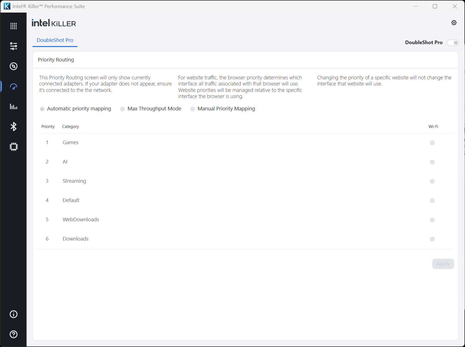 Mit dem Feature Killer Doubleshot Pro kann die Leistung der Netzwerkverbindung erhöht werden, indem alle Netzwerkadapter gleichzeitig verwendet werden können. Das ist vor allem für Gaming-Laptops interessant, bei denen es in der Regel noch einen kabelgebundenen Netzwerk-Anschluss gibt. Im Fall des MSI Stealth lässt sich die Wi-Fi-7-Verbindung beispielsweise noch mit dem Ethernet-Adapter (2,5 GBit/s) kombinieren. Priorisierte Anwendungen werden dabei automatisch der besten verfügbaren Verbindung zugeordnet.