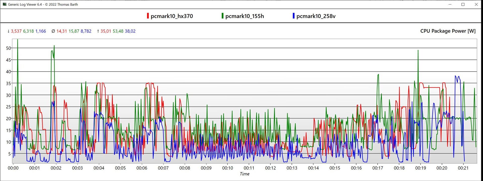 Bisher haben wir nur die Leistung/Effizienz bei voller Belastung verglichen, was aber natürlich bei der Mehrheit der Nutzer nicht den Anforderungen im Alltag entspricht. Allerdings ist das auch für jeden Nutzer anders, weshalb wir uns dazu entschieden haben, den Stromverbrauch während eines PCMark-10-Tests (Dauer ~22 Minuten) zu vergleichen. Wir vergleichen dabei die CPU Package Power des Core Ultra 258V mit dem Core Ultra 7 155H sowie dem Ryzen AI 9 HX 370, jeweils mit den standardmäßigen Power Limits. Obwohl der Core Ultra 7 258V hier durch den RAM etwas im Nachteil ist, bleibt der durchschnittliche Stromverbrauch hier deutlich geringer als bei den anderen beiden Konkurrenten. Für den Lunar-Lake-Chip sind es knapp 9 Watt, für den AMD Zen-5-Prozessor etwas mehr als 14 Watt und der Meteor-Lake-Prozessor benötigt fast 16 Watt.
