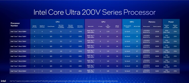 Zum Marktstart stehen insgesamt neun verschiedene Lunar-Lake-CPUs zur Verfügung. Dass es sich um Lunar-Lake-Modelle handelt, ist relativ leicht am letzten Buchstaben der Modellbezeichnung erkennbar, dem "V". Core Ultra 5/7/9 repräsentieren wie gewohnt das generelle Leistungslevel, wobei die Unterschiede im Takt der Kerne sichtbar sind. Die letzte Zahl der dreistelligen Bezeichnung ist ebenfalls sehr wichtig, denn eine 6 steht für 16 GB RAM, die 8 für 32 GB RAM. Die stärkeren Core-Ultra-9/7-Modelle sind mit der Intel Arc Graphics 140V (8 Xe-Kerne der 2. Generation) kombiniert, bei den Core-Ultra-5-Modellen ist es die schwächere Arc Graphics 130V mit 7 Xe-Kernen der 2. Generation.