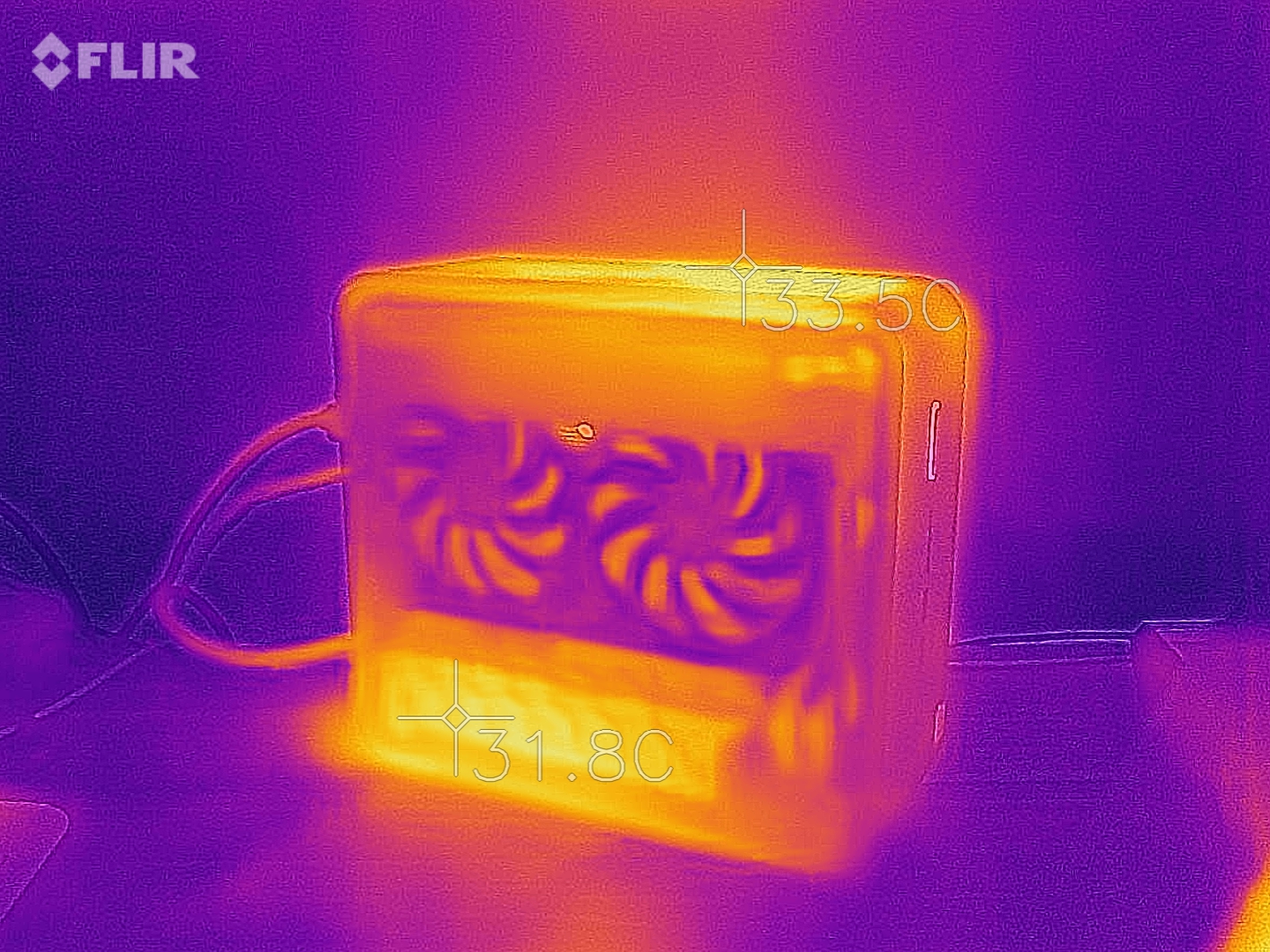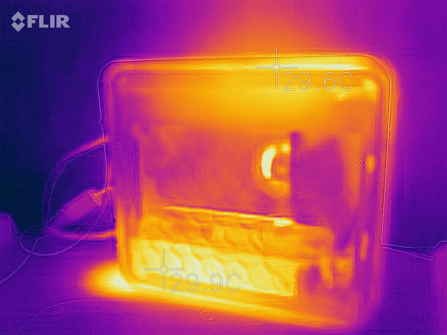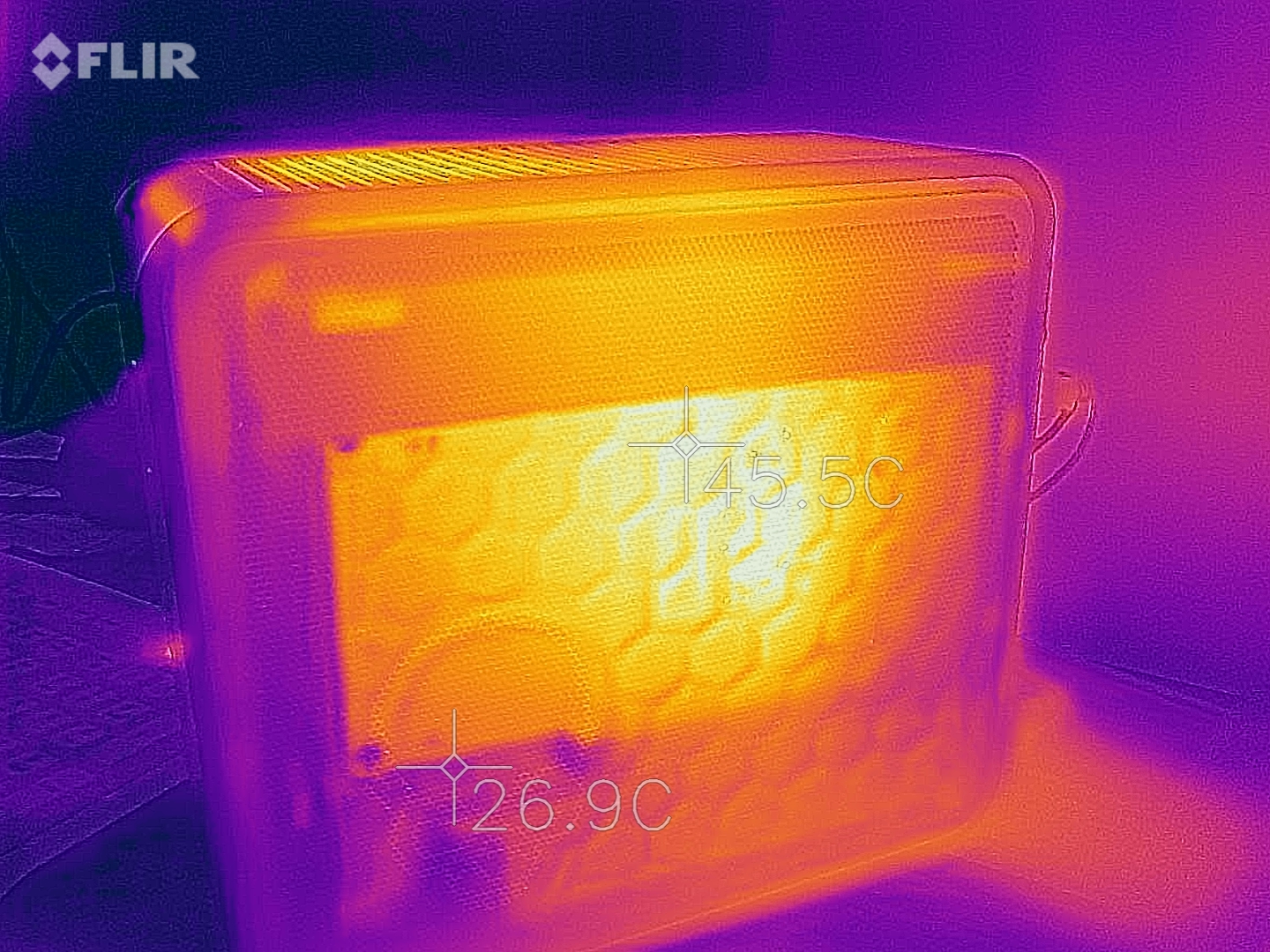 Beim Intel NUC 9 Extreme macht sich der Hersteller den Kamineffekt zur Kühlung der Komponenten zu nutzen. Im Umkehrschluss bedeutet dies, dass an den Seiten kühlere Luft angesaugt wird und nach oben aus dem Gehäuse gefördert wird. Dies funktioniert auch ganz gut, solange keine Grafikkarte den Lüfter der Compute Einheit bedeckt. Bei unserem Stresstes konnten wir glücklicherweise keinen nennenswerten Leistungsverlust aufgrund der schlechteren Kühlung feststellen, aber bei unserer Lautstärkemessung war das System mit eingebauter Grafikkarte deutlich lauter. Beim Prime95-Lasttest kletterte die gemessene Lautstärke von 38,8 dB(A) auf 39,8 dB(A). Warum Intel den Lüfter der Compute Einheit nicht auf der anderen Seite verbaut bleibt uns ein Rätsel. Die Seitenabdeckungen im Mesh-Design würden hier für gute Frischluftversorgung dienen. Beim GPU-Lasttest, für den wir FurMark benutzen, haben wir eine Lautstärke von 48,5 dB(A) gemessen. Dies ist aber auch auf die verbaute RTX 2070 zurückzuführen. Diese erreichte knapp 70 °C und die beiden Lüfter drehten mit 58 Prozent der maximalen Last. Auffällig war hingegen auch deutlich hörbare elektronische Geräusche. Diese hörten sich jedoch nicht wie das typische Spulenfiepen, was man von Grafikkarten her kennt, an. Dies war auch beim Datenzugriff auf die beiden Massenspeicher immer wieder zwischendurch hörbar.