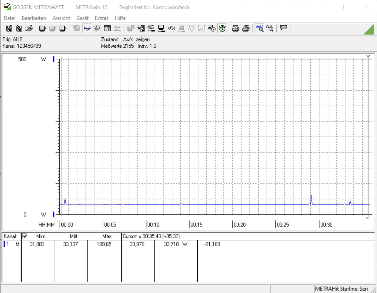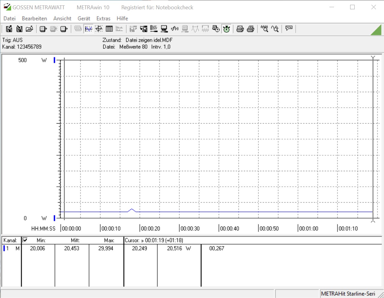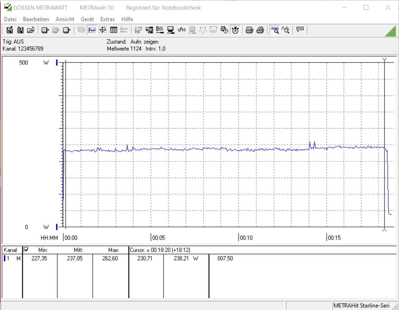 Bei dem Energieverbrauch ist unser Testsample recht sparsam. Im Leerlauf sind es bestenfalls 20 Watt. Den höchsten Verbrauch ohne dedizierte GPU verzeichnen wir beim Cineben-R15-Multi-Test. Hier waren es 127 Watt, die wir an der Steckdose gemessen haben. Bei der Konfiguration mit der GeForce RTX 2070 ist der Energieverbrauch im Leerlauf mit 33 Watt deutlich höher. Beim Stresstest mit FurMark messen wir mit durchschnittlich 251 Watt einen akzeptablen Wert, wenn man bedenkt, dass es sich hierbei um einen Gaming-Rechner handelt. In der Spitze können es auch mal 270 Watt sein, die das 500-Watt-Netzteil bereitstellen muss. Selbst beim Spielen haben wir nicht diesen hohen Energiebedarf gemessen. Gleichwohl fällt der Energiebedarf beim Zocken mit 237 Watt im Schnitt nicht viel geringer aus.