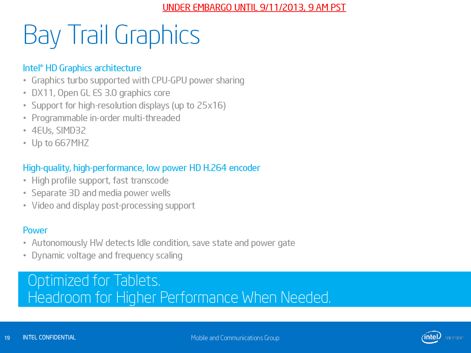 Ähnlich grundlegende Änderungen hat die Grafikeinheit erfahren. Diese basiert auf Intels DirectX-11-fähiger Gen7-GPU (Ivy-Bridge-Serie), bietet hier allerdings nur 4 EUs (HD Graphics: 6 EUs) und taktet mit maximal 667 MHz deutlich niedriger – im Vergleich zu früheren Atom-GPUs dennoch ein deutlicher Schritt nach vorn. Das gilt auch für die Multimedia-Fähigkeiten der neuen Generation: So kann Bay Trail nicht nur mit einem besonders sparsamen Videodecoder für die gängigsten Codecs glänzen (bis zu 4K und 100 Mbit/s), sondern verfügt auch über einen spezialisierten H.264-Hardwareencoder ähnlich zu Quick Sync. Das Bildsignal kann per HDMI 1.4 (max. 1.920 x 1.080) oder DisplayPort 1.2 (max. 2.560 x 1.600) an bis zu zwei Displays ausgegeben werden.