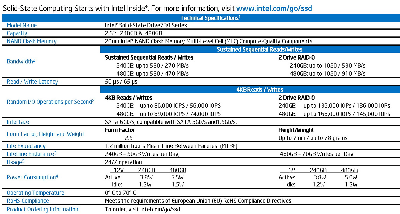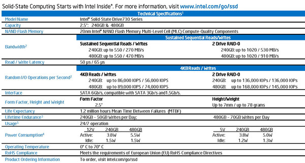 Dank einem schnelleren Controller und den besseren MLC-Speicherchips der dritten Generation in 20-nm-Fertigung spricht Intel von einer um mehr als 50 Prozent höheren Gesamtperformance bei den Modellen der Reihe SSD 730 im Vergleich zur SSD 530 Serie. Die neue Serie SSD 730 von Intel kommt mit SATA-6-Gb/s-Interface auf eine sequenzielle Schreib- und Lesegeschwindigkeit von bis zu 470 MB/s respektive 550 MB/s (480-GB-Modell). Bei den 4KB Reads/Writes werden bis zu 89000 IOPS und 74000 IOPS genannt.