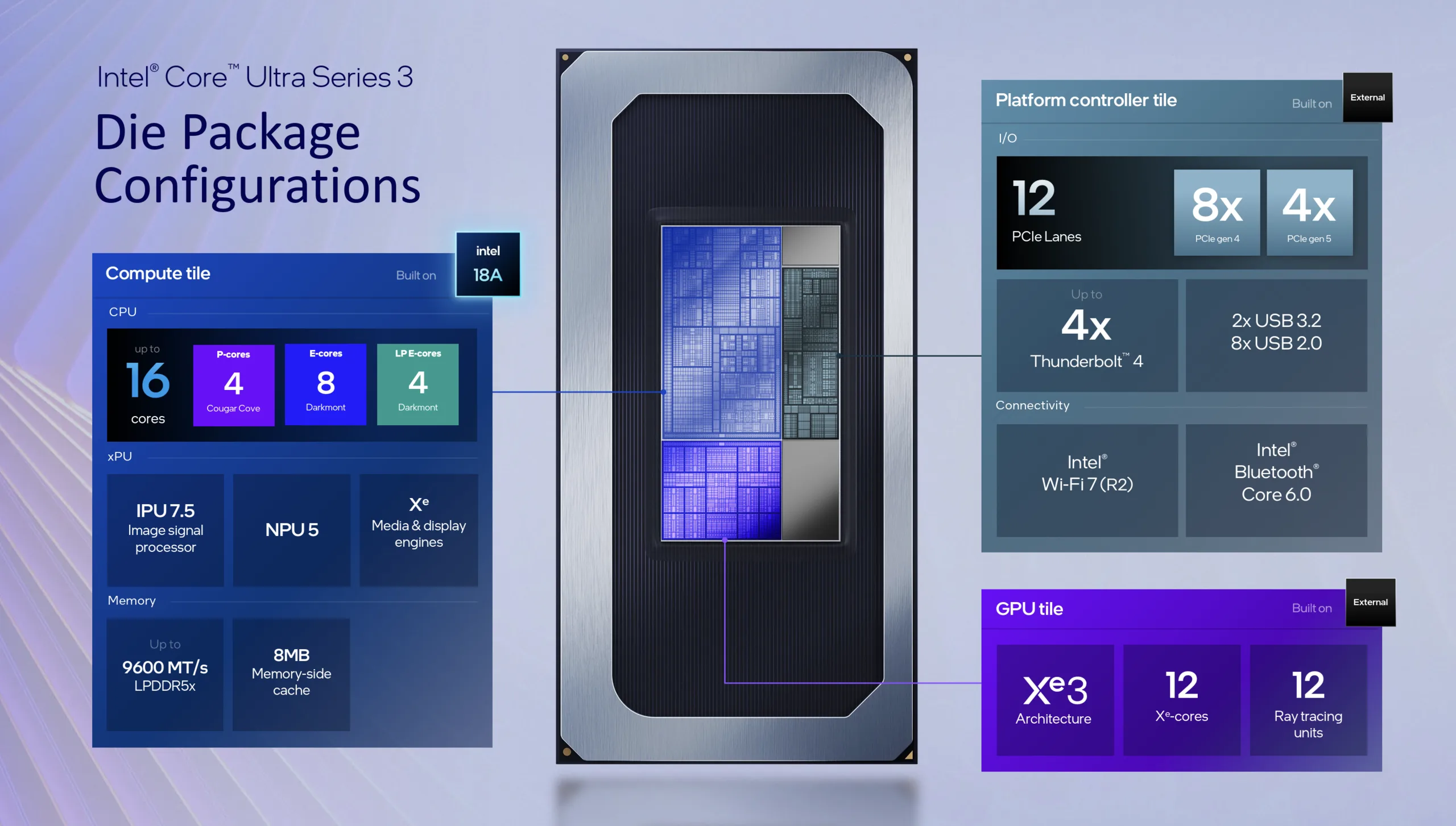 Die neuen Panther-Lake-Mobilprozessoren setzen sich erneut aus verschiedenen Tiles zusammen, wobei der Compute-Tile von Intel selbst produziert wird (Intel 18A). Je nach Modell kommen insgesamt bis zu 16 Kerne zum Einsatz: vier schnelle P-Kerne (Cougar Cove), acht E-Kerne (Darkmont) sowie vier weitere Low-Power E-Kerne (Darkmont). Zudem sind NPUs mit 46-50 TOPS verbaut, alle Panther-Lake-Prozessoren erfüllen also die Mindestanforderung für die Copilot+-Zertifizierung von Microsoft. Die anderen beiden Tiles (Platform Controller und GPU) werden von TSMC gefertigt.
