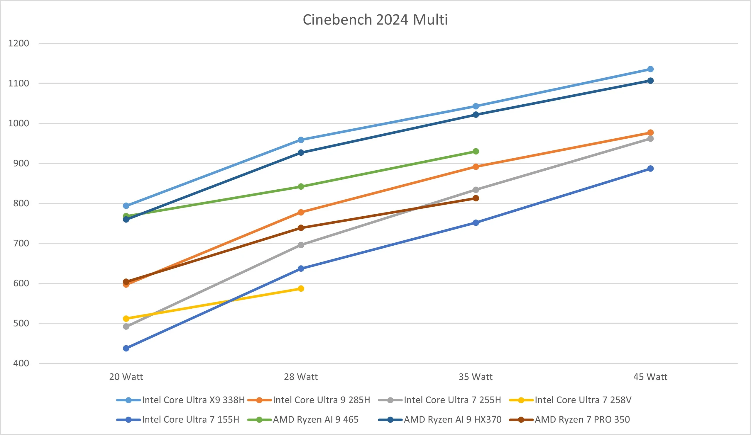 Bei der Multi-Core-Effizienz muss man sich neben er reinen Leistung auch die TDP-Werte ansehen. Für den X9 388H haben wir neben den normalen Power Limits auch noch Messungen mit festen Power Limits bei 20, 28, 35 sowie 45 Watt durchgeführt. Auch für den neuen Ryzen AI 9 465 haben wir zusätzliche Messungen bei 20, 28 und 35 Watt durchgeführt. Natürlich steigt die Effizienz mit geringeren Power Limits.