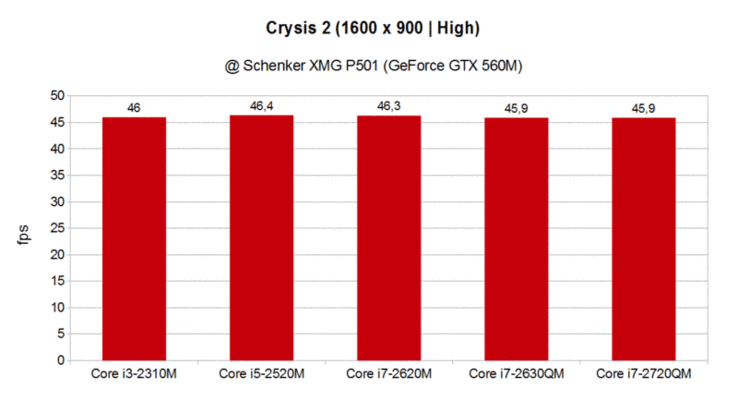 Die ermittelten Resultate zeigen deutlich, dass der Ego-Shooter extrem GPU-lastig ist. Der Performanceunterschied zwischen der günstigsten und der teuersten CPU betrug gerade einmal 0.5 fps. Bereits der lediglich mit 2.10 GHz getaktete Core i3-2310M (kein Turbo-Modus) reicht für eine flüssige Bildwiederholrate aus.