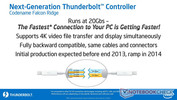 Auch zu seinem Next-Generation Thunderbolt Controller mit Codenamen Falcon Ridge machte Intel auf der NAB offizielle Aussagen. Neben einer Erhöhung der Geschwindigkeit auf bis zu 20 Gbps steht eine Reduzierung des Energieverbrauchs und die Unterstützung von 4K-Auflösungen von bis zu 4.096 x 2.560 Pixeln über das Thunderbolt-Kabel auf dem Plan. Falcon Ridge soll bereits Ende 2013 in Produktion gehen und 2014 auf den Markt kommen.