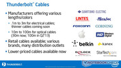 Wie Intel auf der Broadcaster-Messe ankündigte, wird an Thunderbolt weiter eifrig entwickelt. Im aktuellen Thunderbolt Technology Update kündigt Intel für die derzeitige Technik dünnere und längere Kabel an, die künftig zudem auch günstiger angeboten werden sollen. Zudem stellte der Chipkonzern seinen Intel DSL4510/4410 Thunderbolt Controller mit Codename Redwood Ridge vor, der Unterstützung für DisplayPort 1.2 mitbringt, das Power Management verbessert und die Plattformkosten senken soll.