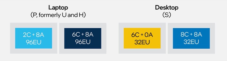 Intel bestätigt auch, dass sämtliche Desktop-Prozessoren einen integrierten Grafikchip mit nur 32 Execution Units (EUs) erhalten, während bei Notebook-Chips eine iGPU mit 96 EUs zum Standard wird, und zwar auch bei den leistungsstärkeren Prozessoren der ehemaligen H-Serie, die bislang mit langsameren Grafikchips auskommen musste. So gibt es Notebook-Prozessoren mit 2 bis 8 P-Kernen, die in jedem Fall mit bis zu 8 E-Kernen kombiniert werden.