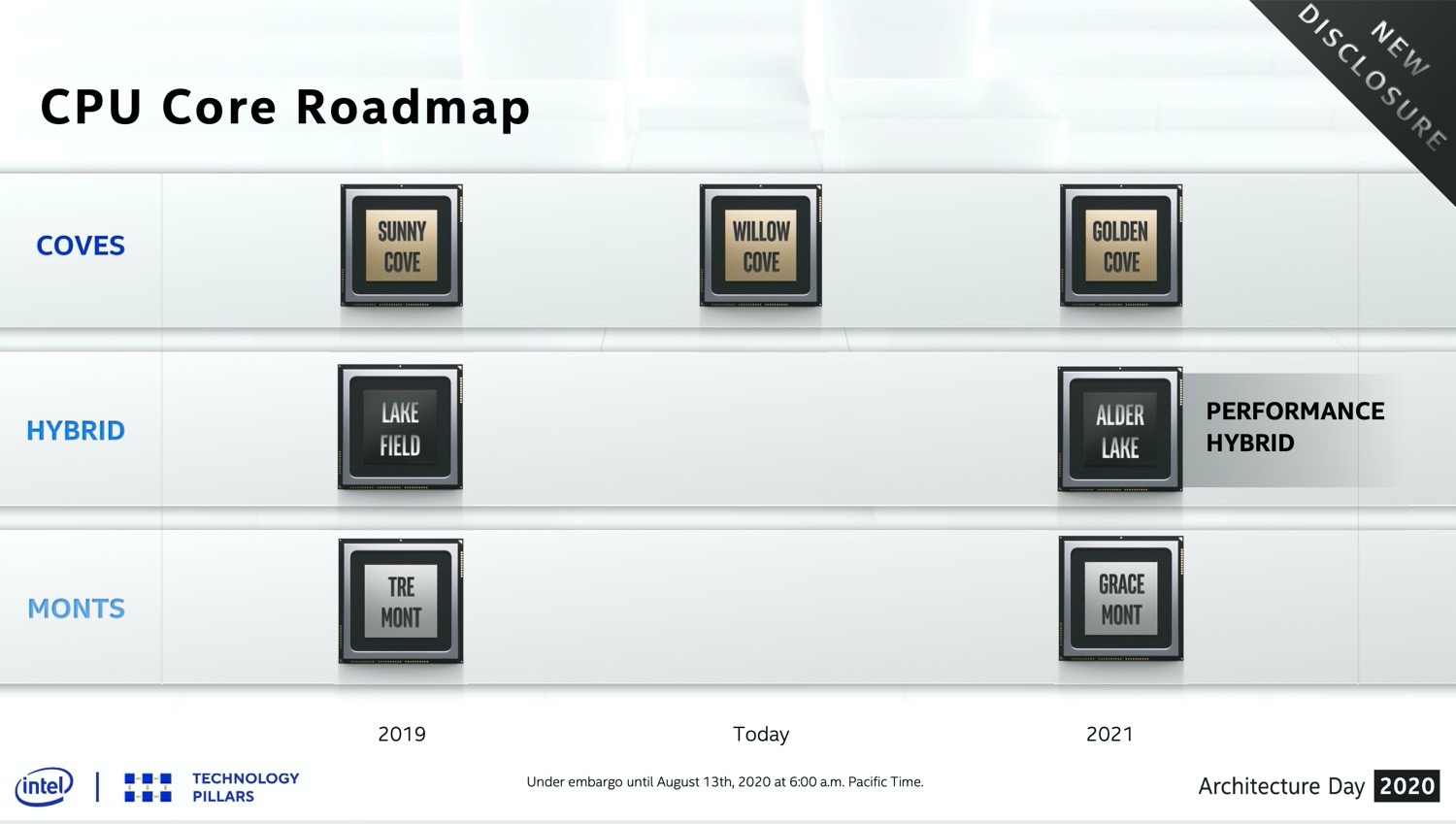 Wie in der unten eingebetteten Roadmap zu sehen plant Intel für das nächste Jahr gleich drei neue Architekturen: Golden Cove – den Nachfolger von Willow Cove, Alder Lake – den im Vergleich zu Lakefield leistungsstärkeren Hybrid-Chips und die effizienten Gracemont-Kerne.