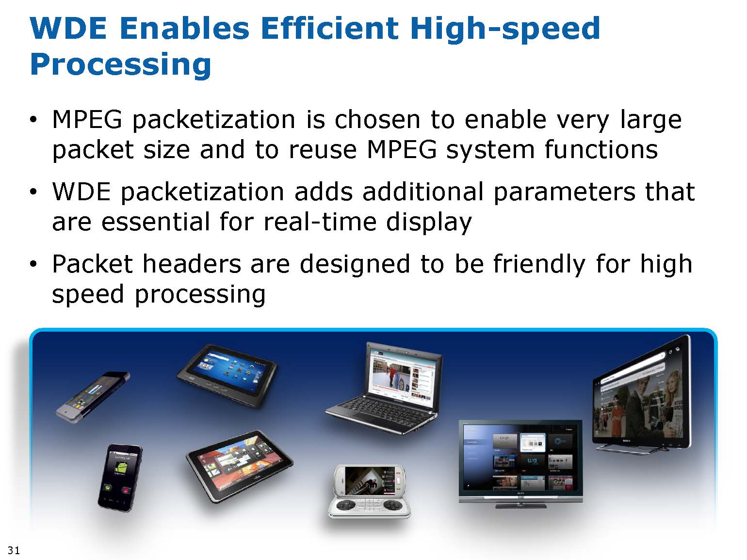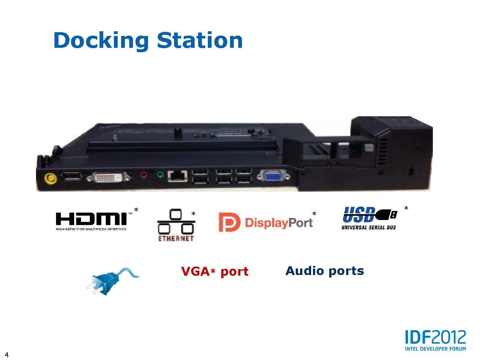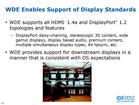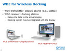 Als WDE-Sender kann beispielsweise ein Ultrabook dienen, das die Displaydaten komprimiert (H.264) und drahtlos zur Docking-Station funkt, die entweder ein Stand-alone-Gerät oder auch direkt in das Display integriert sein kann. WDE unterstützt zudem vollständig HDMI 1.4a und DisplayPort 1.2.
