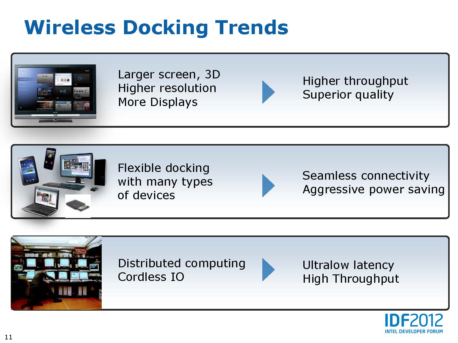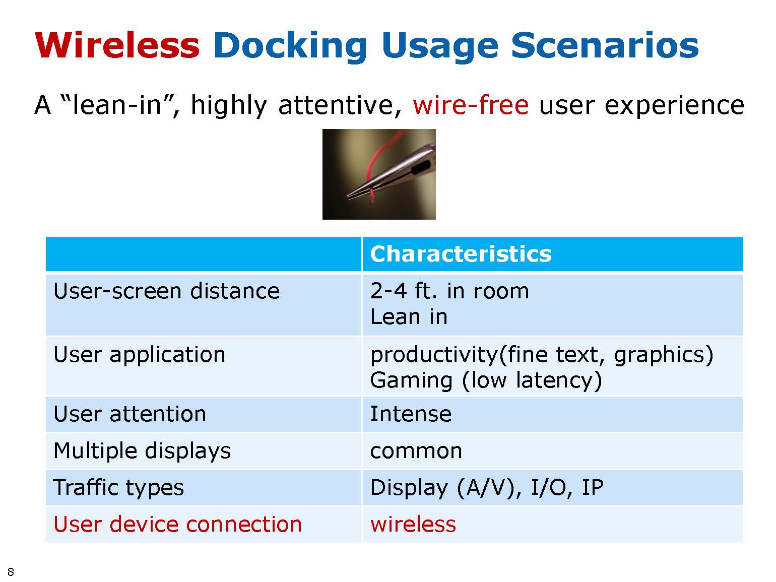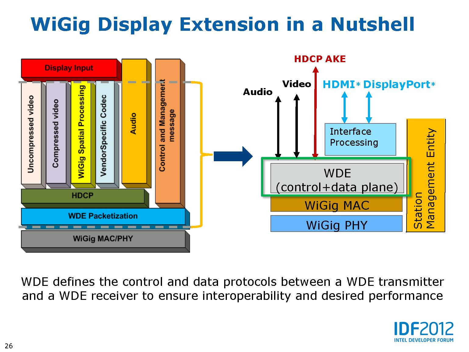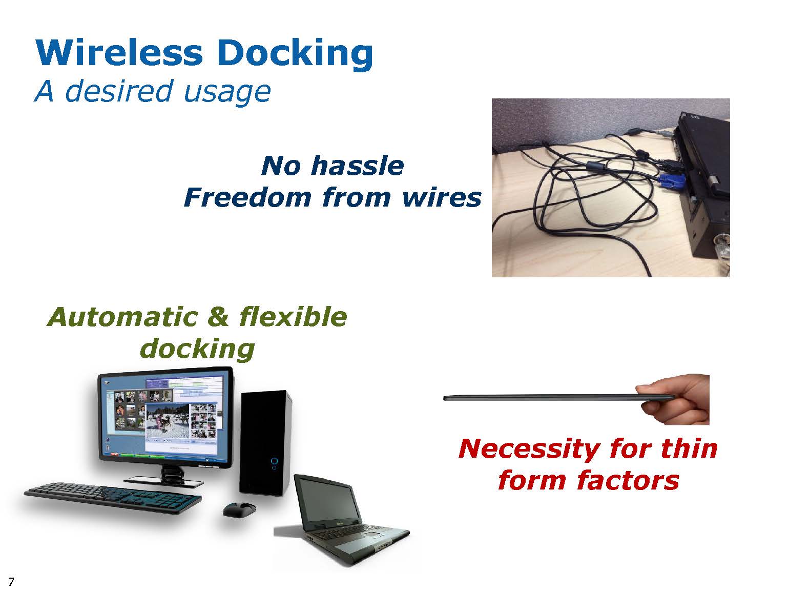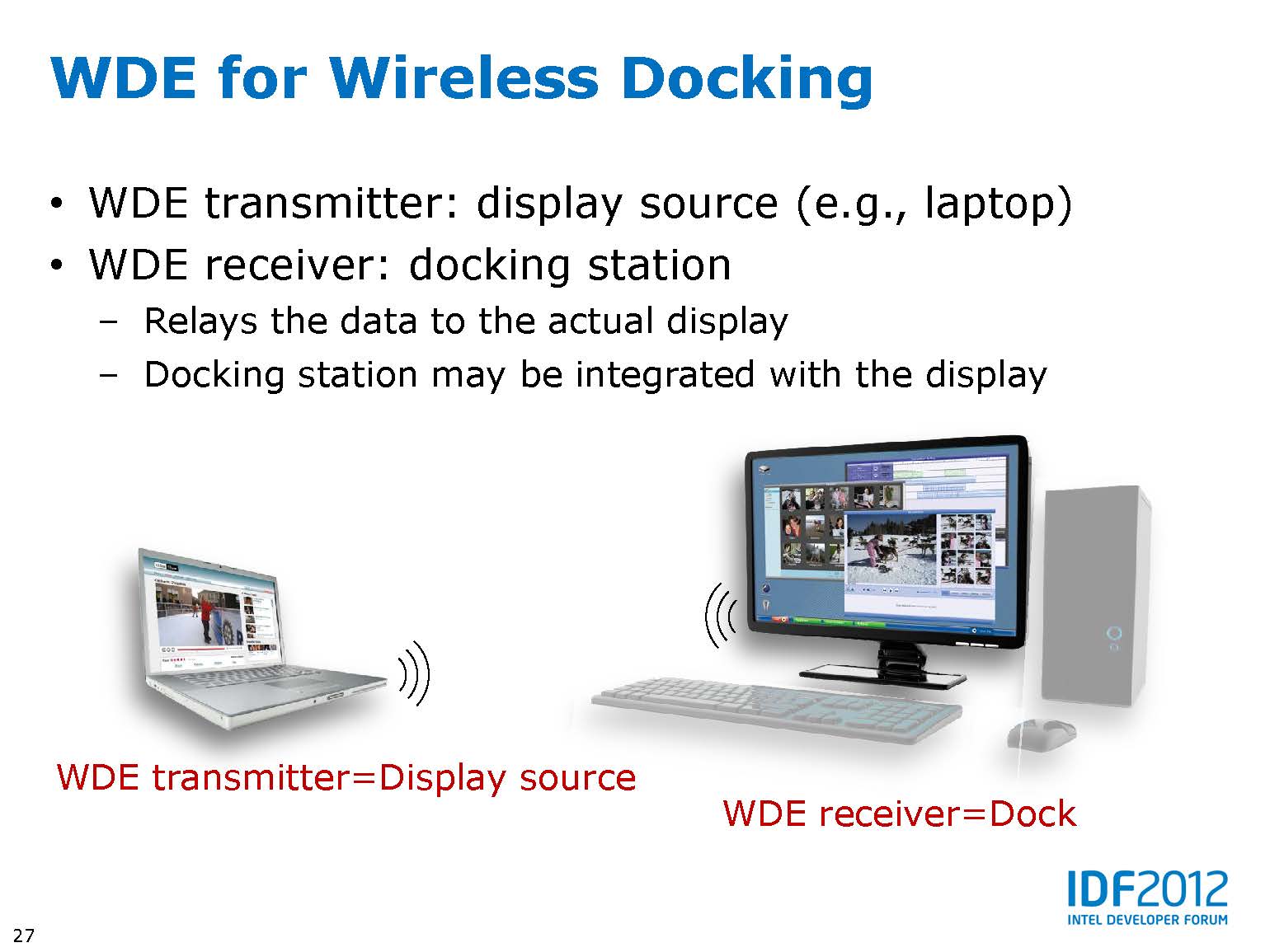Trotz dem Verzicht auf Kabel möchte der Kunde aber bei der Bildqualität oder dem Ansprechverhalten von Geräten wie einer Computermaus oder Tastatur keine Abstriche hinnehmen müssen. Um alle diese Ansprüche unter einen Hut zu bringen, favorisiert Intel daher für kabellose Docking-Lösungen WiGig. Die WiGig Display Extension (WDE) definiert dabei die Kontroll- und Daten-Protokolle für die Anzeige.