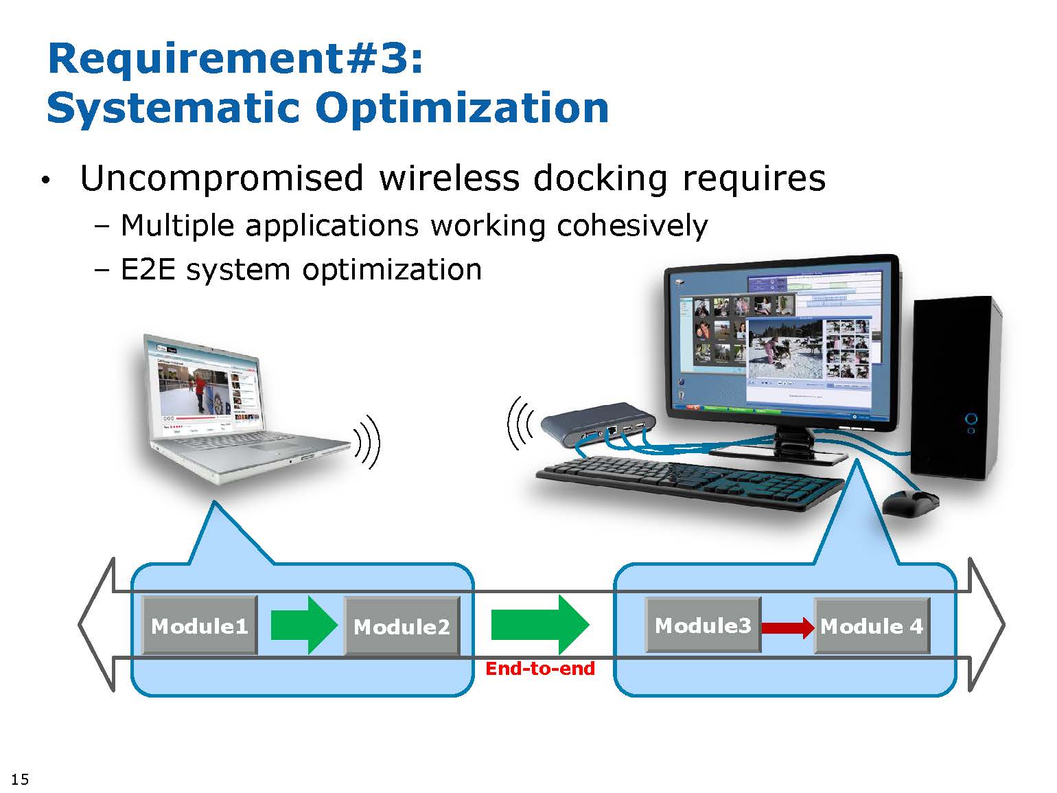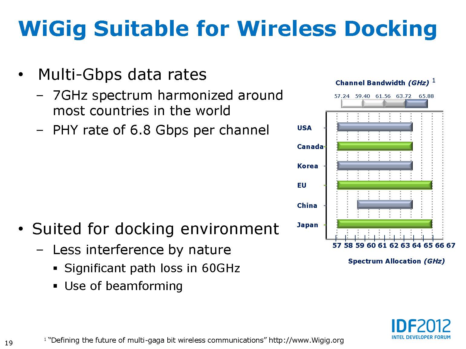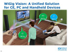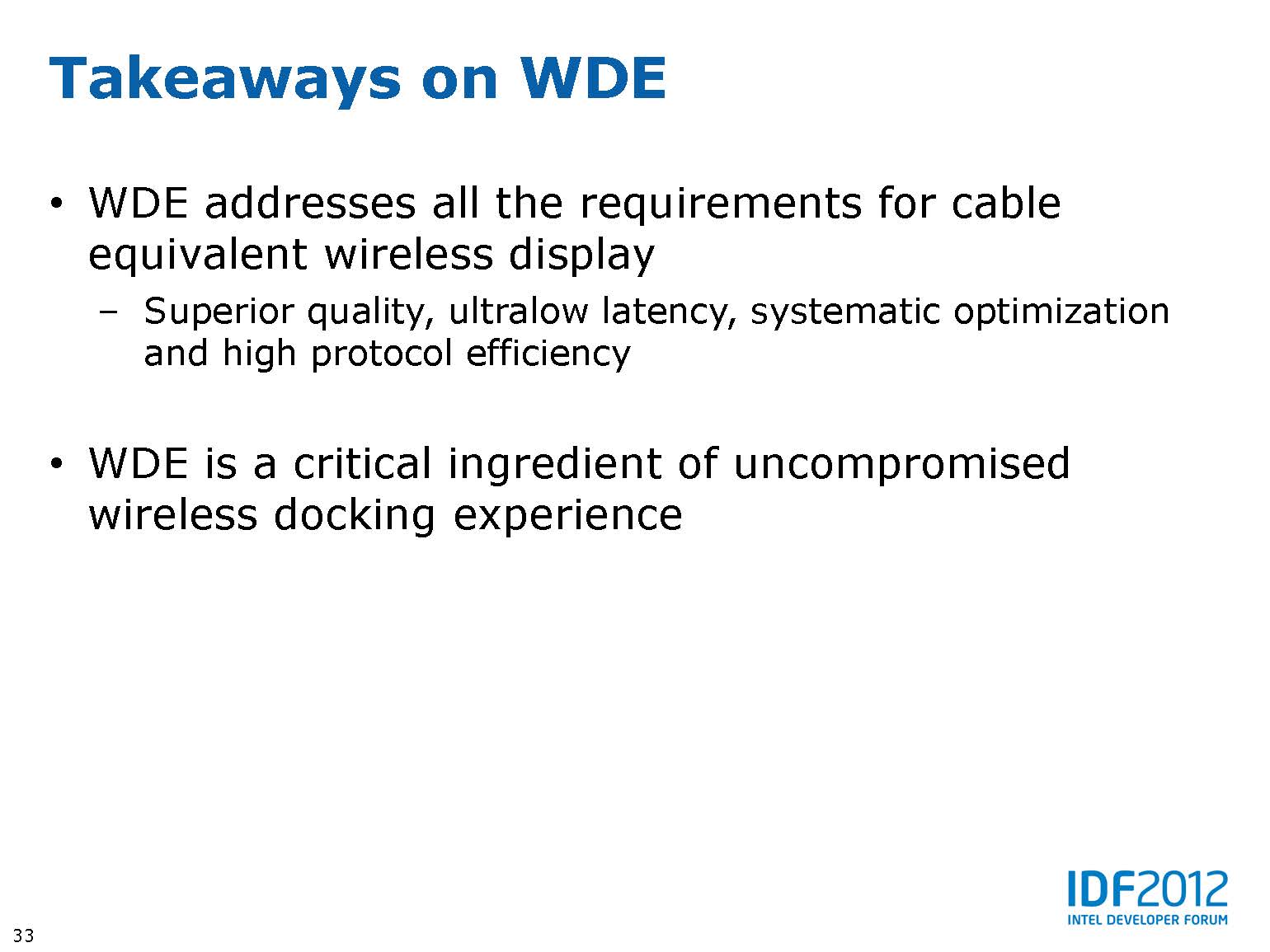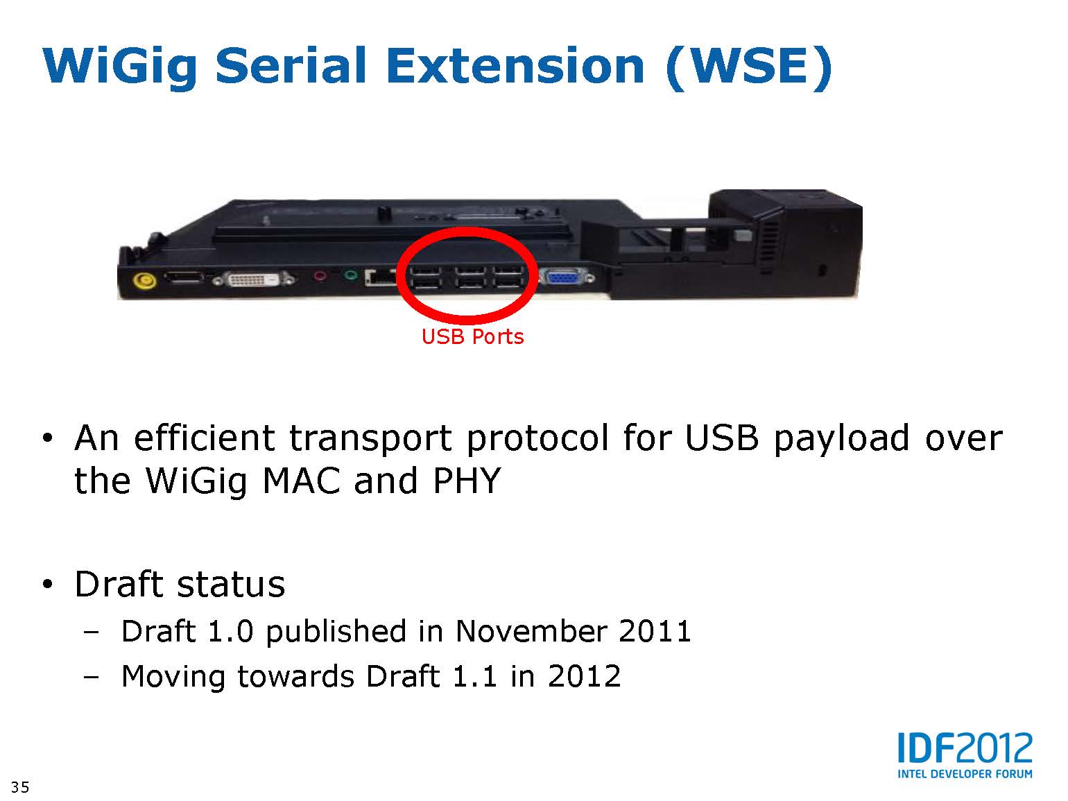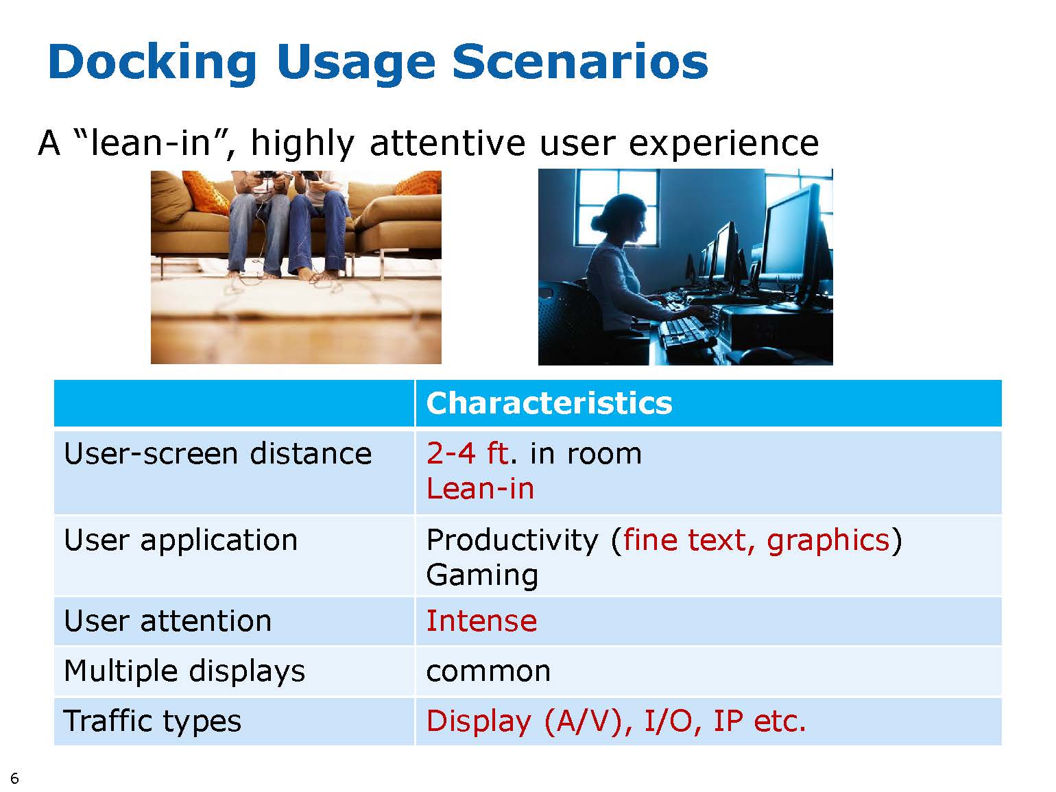 Trotz dem Verzicht auf Kabel möchte der Kunde aber bei der Bildqualität oder dem Ansprechverhalten von Geräten wie einer Computermaus oder Tastatur keine Abstriche hinnehmen müssen. Um alle diese Ansprüche unter einen Hut zu bringen, favorisiert Intel daher für kabellose Docking-Lösungen WiGig. Die WiGig Display Extension (WDE) definiert dabei die Kontroll- und Daten-Protokolle für die Anzeige.