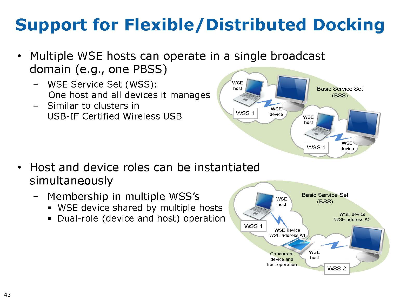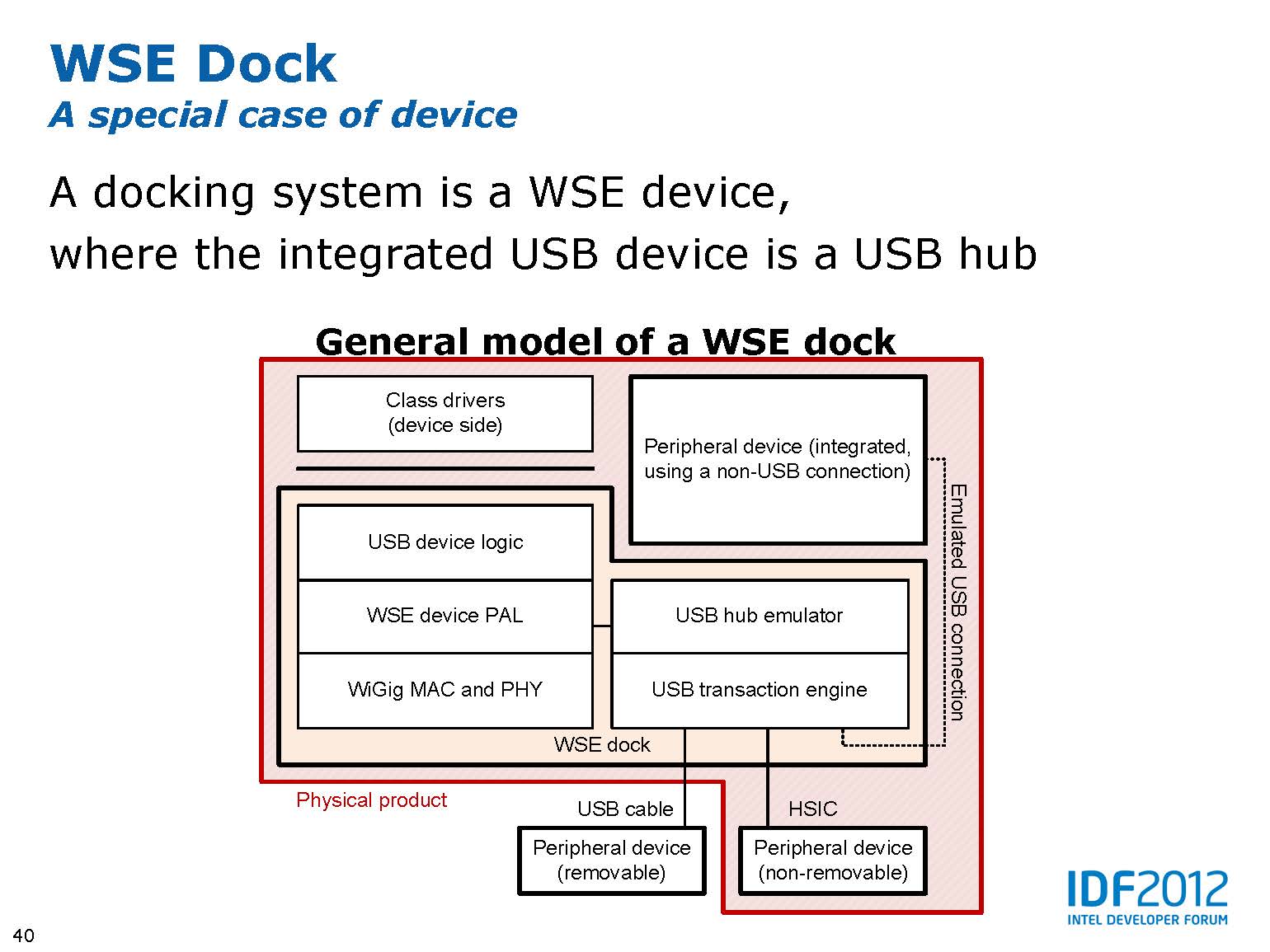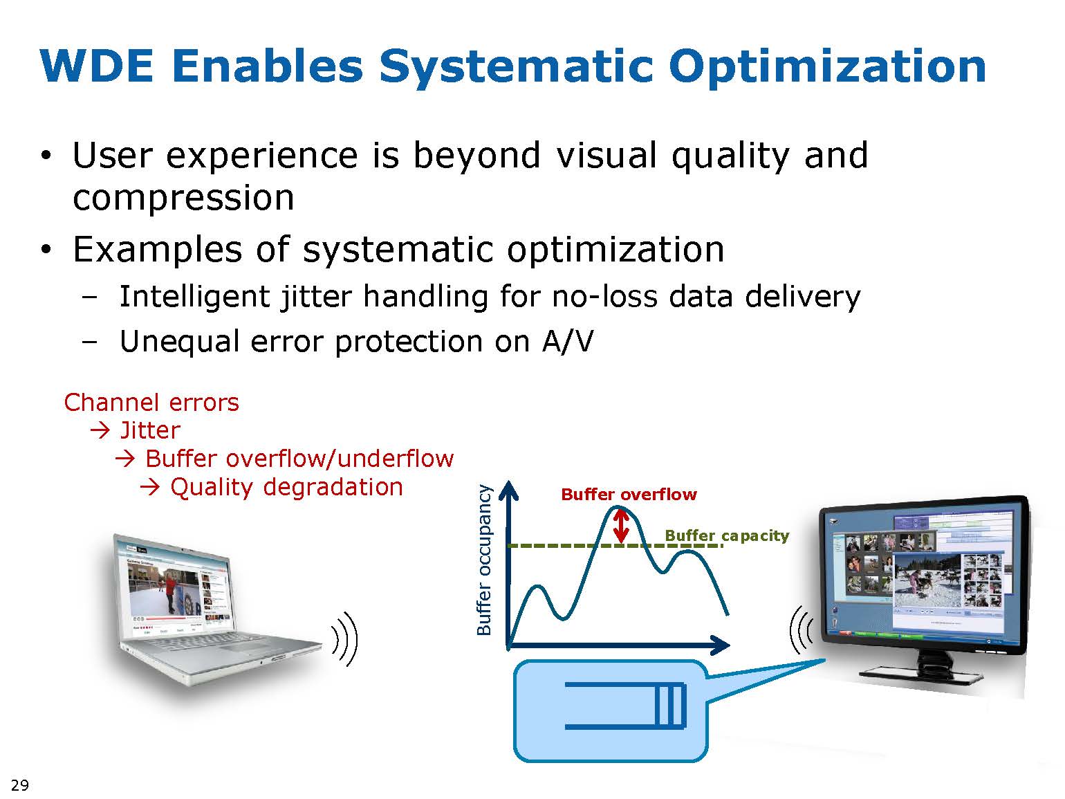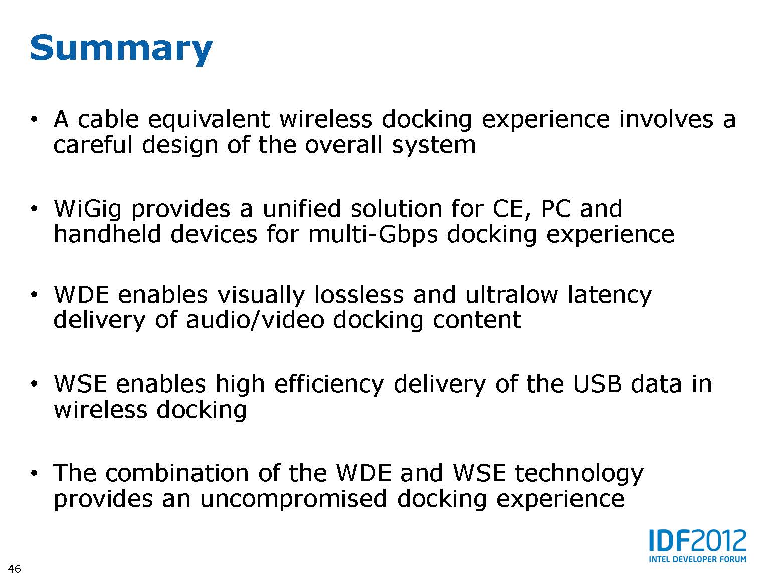 Trotz dem Verzicht auf Kabel möchte der Kunde aber bei der Bildqualität oder dem Ansprechverhalten von Geräten wie einer Computermaus oder Tastatur keine Abstriche hinnehmen müssen. Um alle diese Ansprüche unter einen Hut zu bringen, favorisiert Intel daher für kabellose Docking-Lösungen WiGig. Die WiGig Display Extension (WDE) definiert dabei die Kontroll- und Daten-Protokolle für die Anzeige.