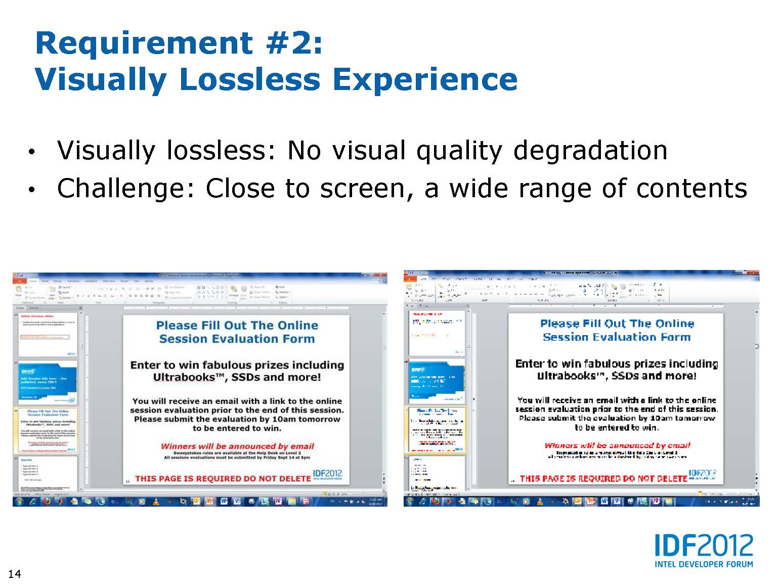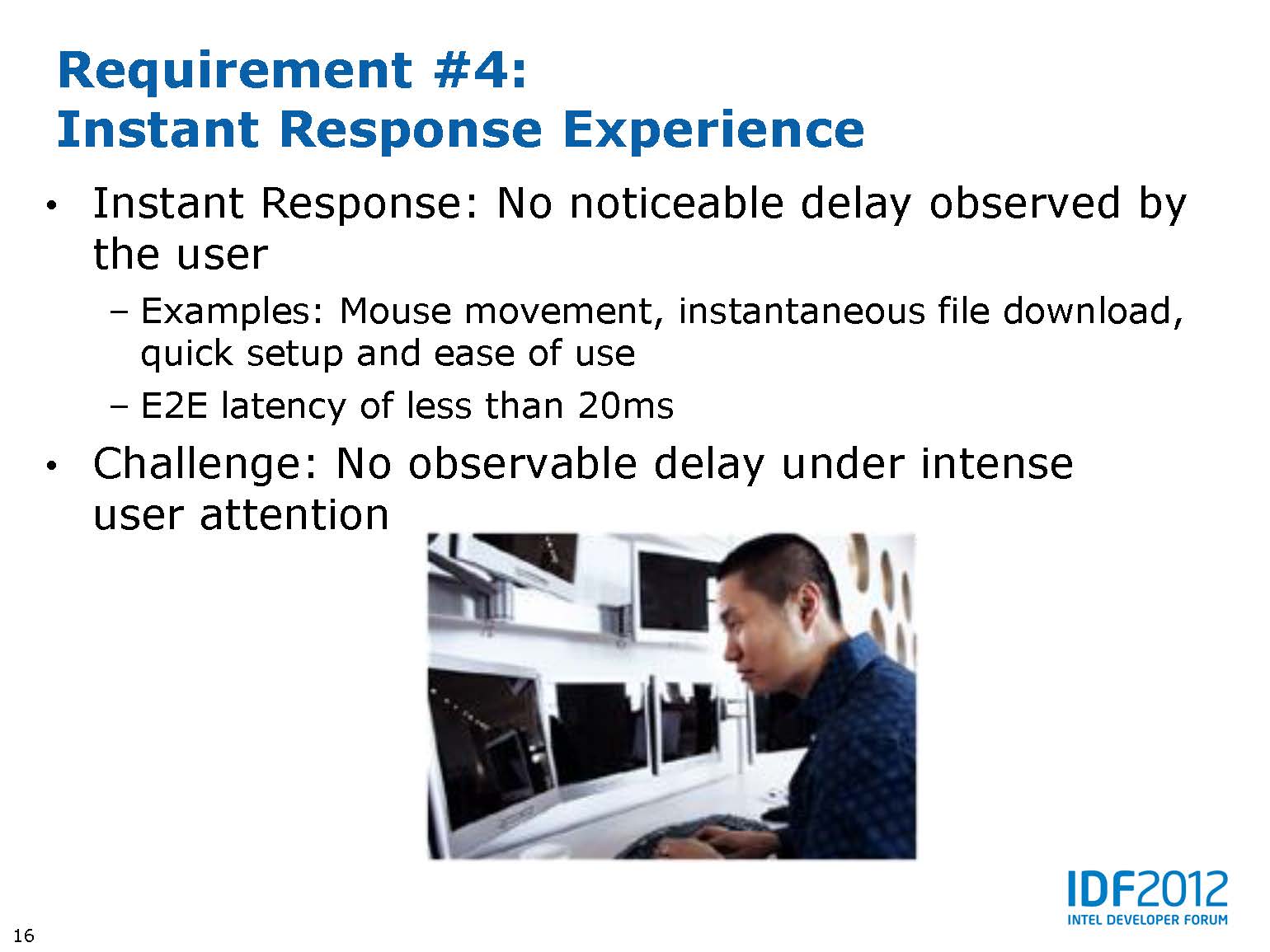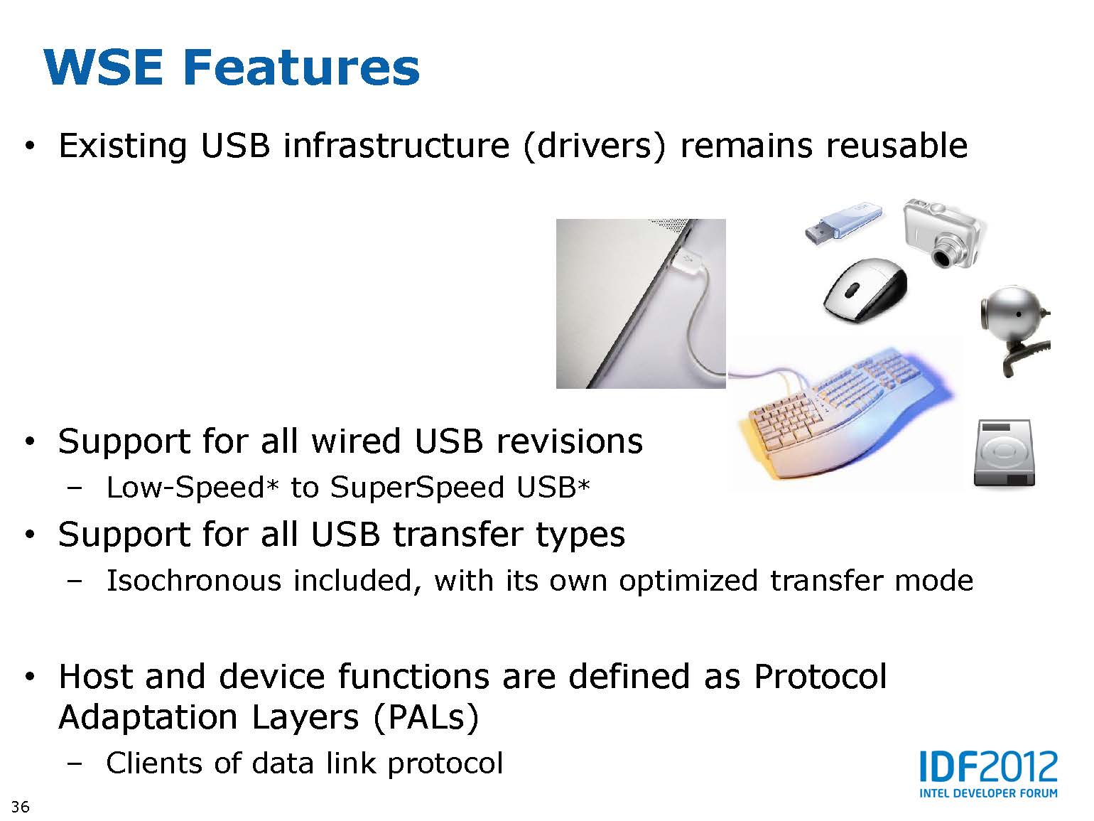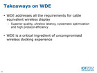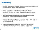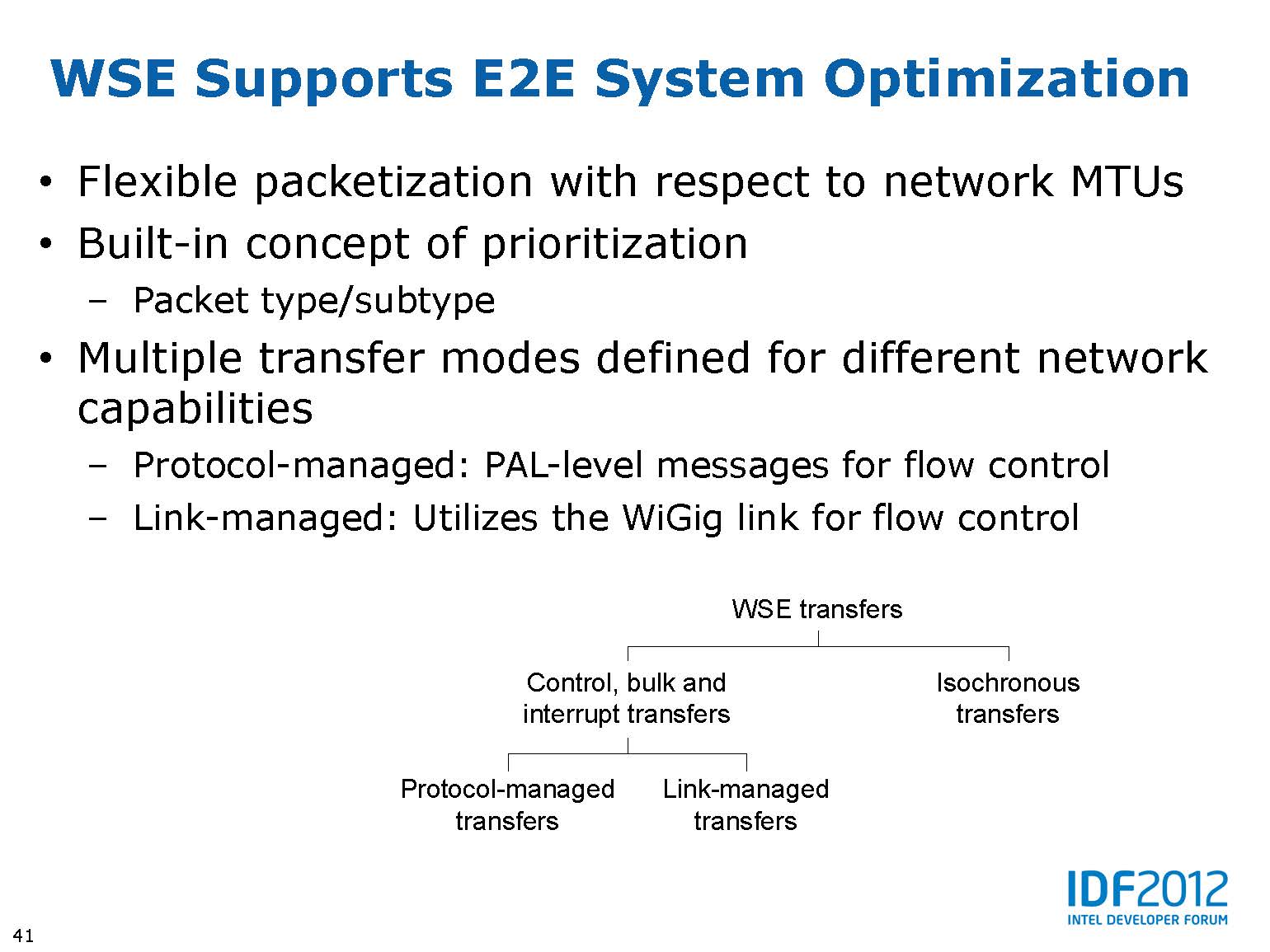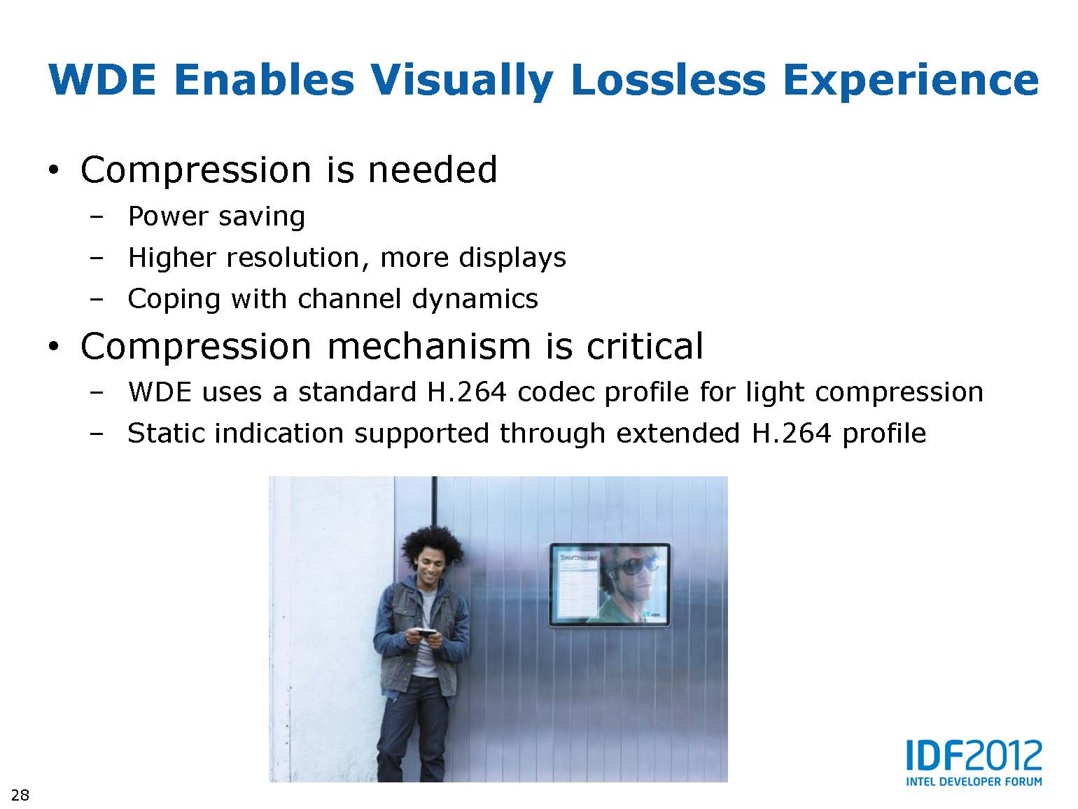 Trotz dem Verzicht auf Kabel möchte der Kunde aber bei der Bildqualität oder dem Ansprechverhalten von Geräten wie einer Computermaus oder Tastatur keine Abstriche hinnehmen müssen. Um alle diese Ansprüche unter einen Hut zu bringen, favorisiert Intel daher für kabellose Docking-Lösungen WiGig. Die WiGig Display Extension (WDE) definiert dabei die Kontroll- und Daten-Protokolle für die Anzeige.
