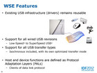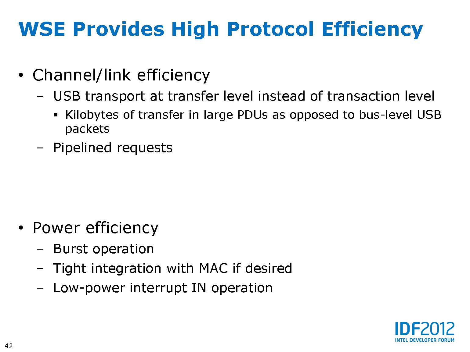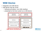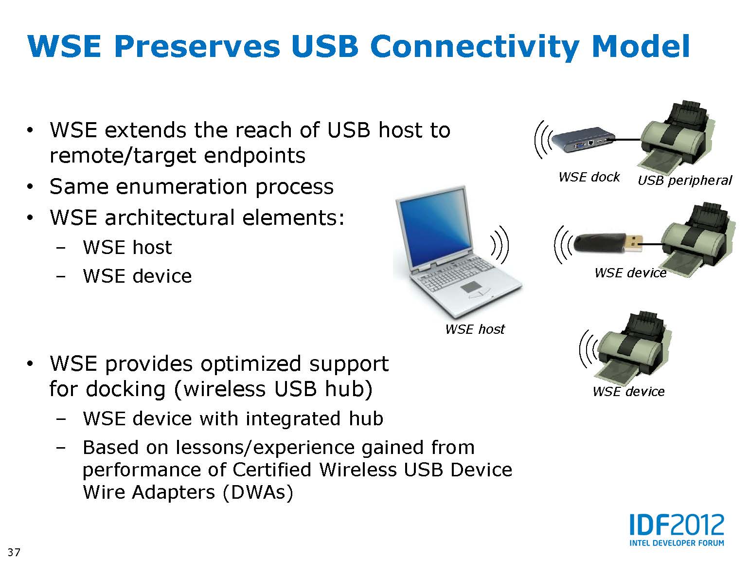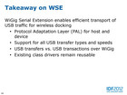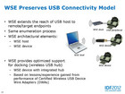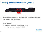 Die WiGig Serial Extension (WSE) definiert hingegen ein effizientes Transportprotokoll für USB, das alle USB-Kabel- und Übertragungsstandards unterstützt. Die WSE-Architektur nutzt das Host-Device-Prinzip, wobei jedes WSE-Device mit einem integrierten Wireless-USB-Hub ausgerüstet ist. Die USB-Device-Architektur erlaubt aber auch virtuelle Geräte per Softwareemulation, die sich gegenüber dem Host als vollwertige USB-Geräte ausweisen.