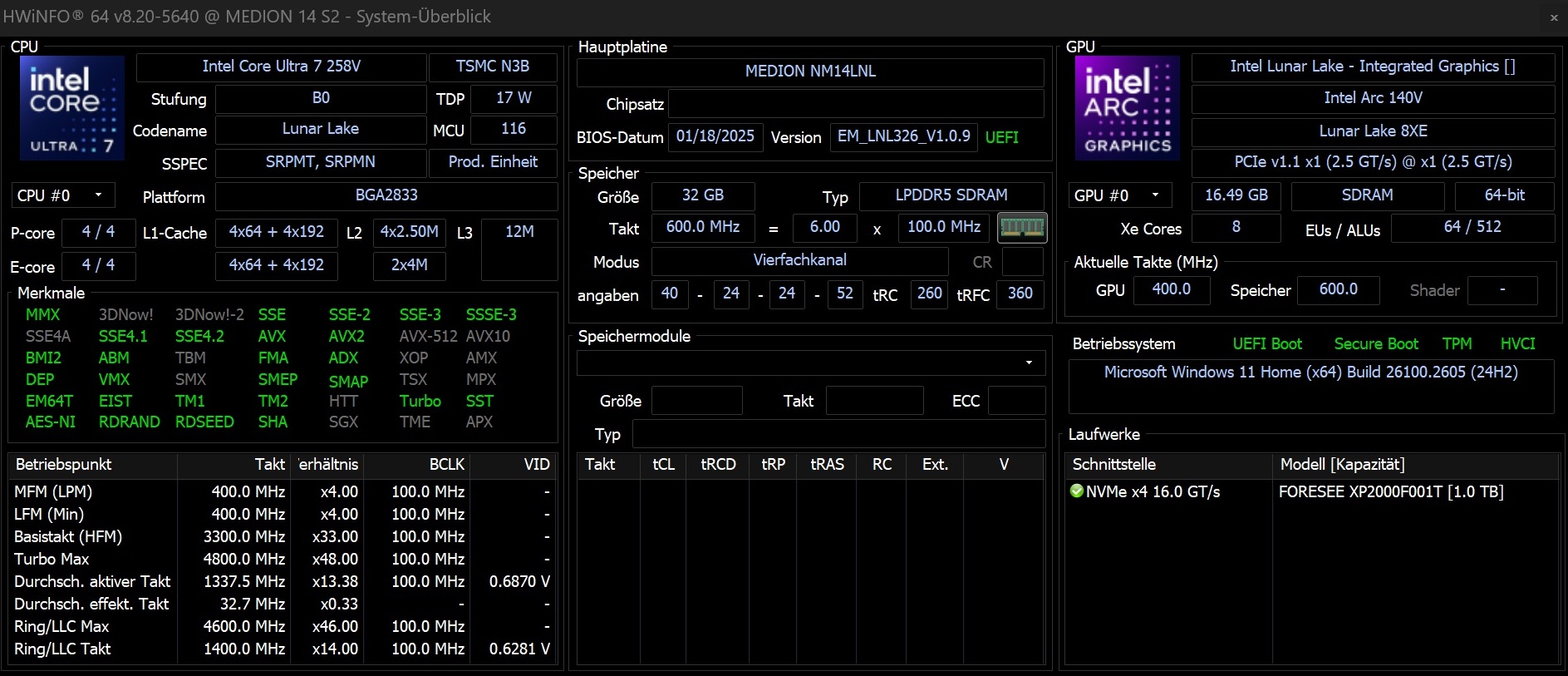 Das Testmodell mit der Bezeichnung MD62722, welches einen Core Ultra 7 258V, 32 GB verlöteten LPDDR5x-RAM und eine 1 TB große SSD beherbergt, ist bei einzelnen Händlern (unter anderem Medion selbst) derzeit für rund 1.300 Euro verfügbar.