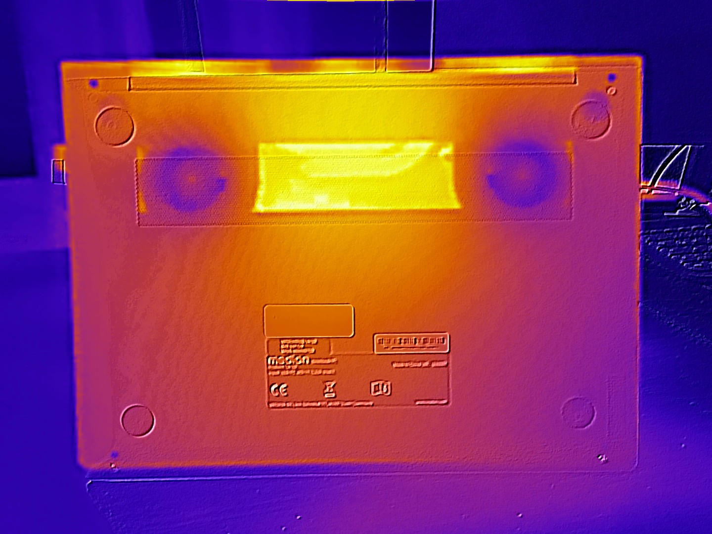 Die Temperaturen fallen unter Last hingegen ordentlich aus und ziehen mit maximal 42 °C auf der Oberseite und maximal 46 °C auf dem Gehäuseboden nicht an der Konkurrenz vorbei. Im Idle-Betrieb erwärmt sich das Chassis auf knapp über 30 °C, was weder wenig noch besonders viel ist.