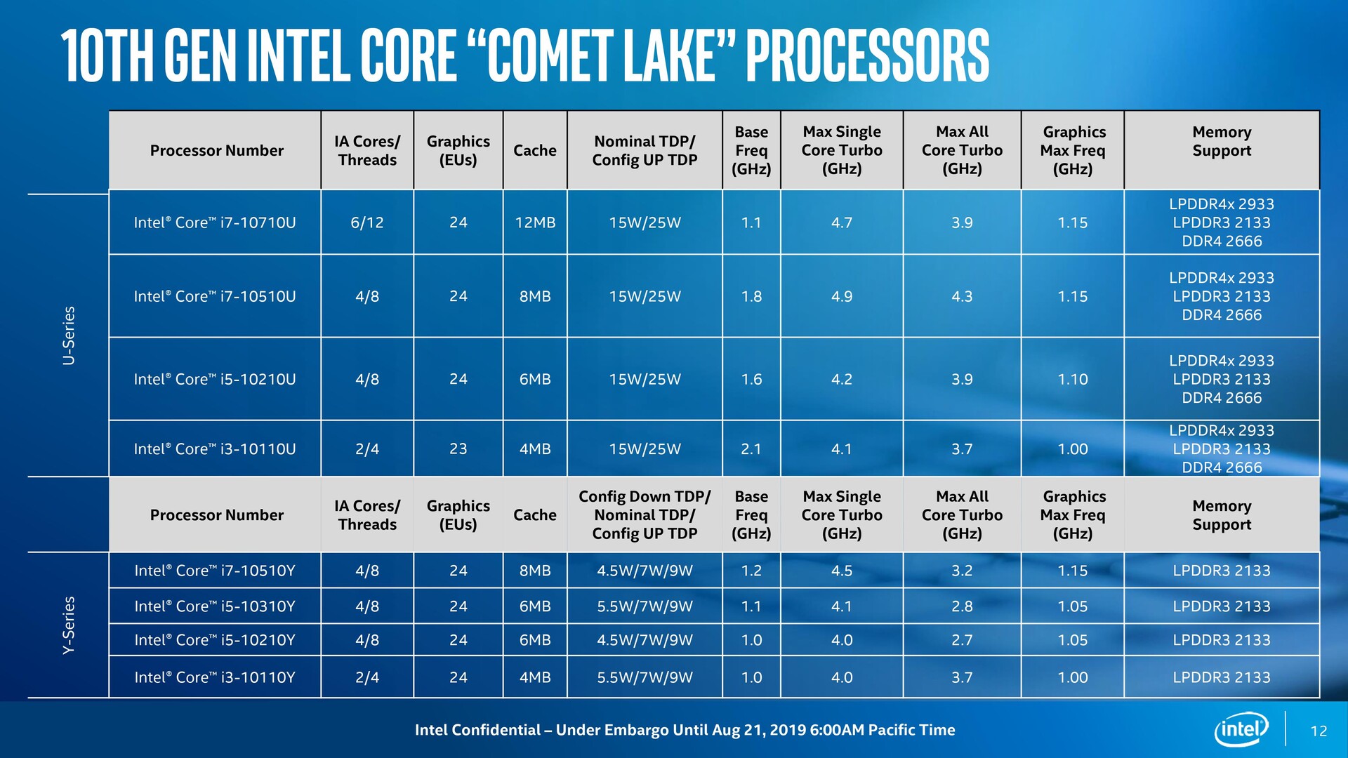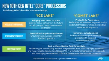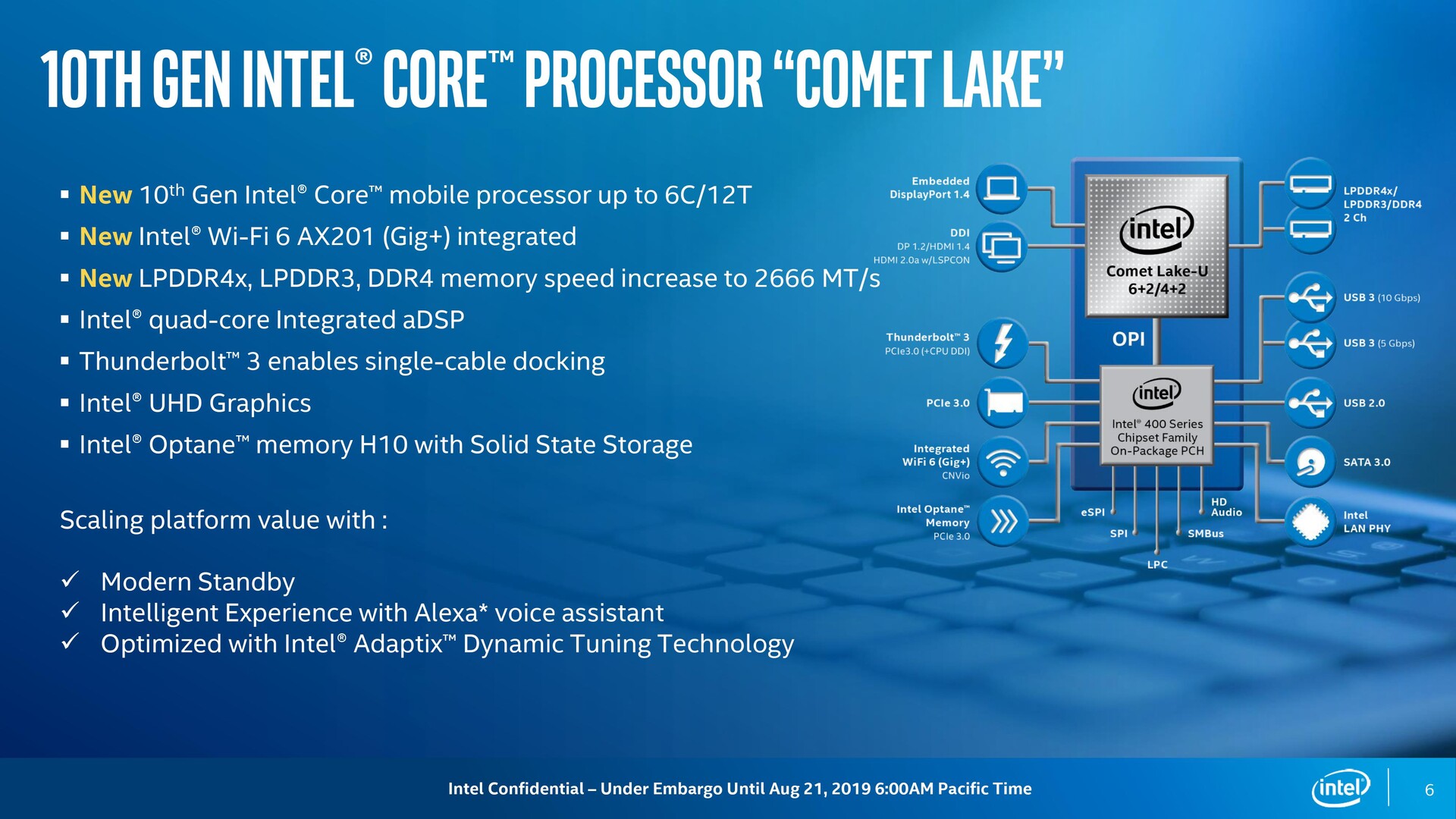 Intel sieht die erstmals als 15 Watt Hexacore-CPUs mit 12 Threads erhältlichen Comet Lake-U-Prozessoren als eine Art Mini-Workstation-CPUs, sie sollen das durch die Ice Lake-Prozessoren abgedeckte Mobilsegment der dünnen und leichten Geräte performancemäßig also noch oben hin abrunden und das mit all den positiven Nebeneffekten, die in der 10. Core-Generation Standard sind, das wären insbesondere Thunderbolt 3 und Wi-Fi 6 sowie die KI-Algorithmen namens Adaptix für systemabhängige Performanceoptimierung. Da wir dank eines frühen Core i7-10510U-Samples in einem Schenker-Notebook bereits kurz testen durften, können wir Intels Hypothese hier (noch) nicht ganz nachvollziehen zudem gibt es dann ja auch noch die Comet Lake-Y-Chips mit 7 Watt und 4 Kernen, die sich wohl als günstigere Alternative zu den moderneren Ice Lake-CPUs in superdünnen PC-Designs anbieten werden.
