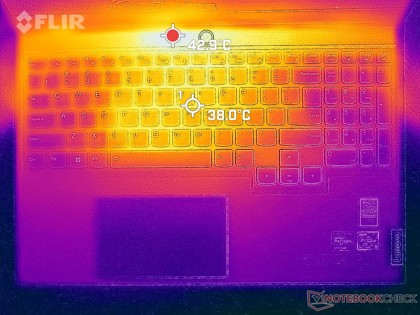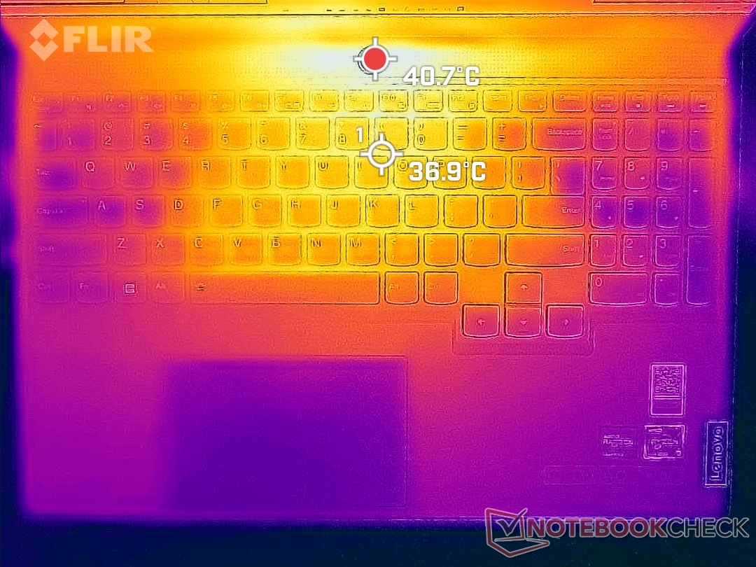 Die Oberflächentemperaturen sind oberhalb der Tastatur am wärmsten. Der Hotspot auf der Tastatur kann mehr als 37 °C erreichen, verglichen mit nur 33 °C beim Dell G16. Im Gegensatz zum Lenovo ist die Tastatur des Dells näher am vorderen Ende platziert, sodass sie sich weiter weg vom Prozessor befindet, was einige der Temperaturunterschiede erklären mag.