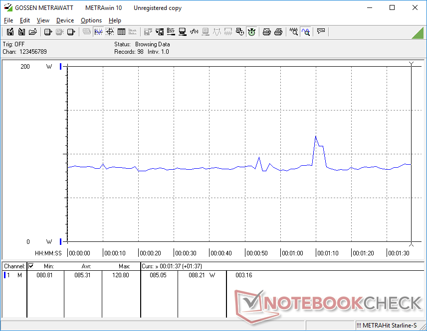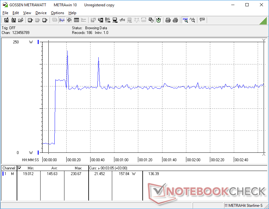 Wir messen ein temporäres Leistungsmaximum von 231 W für das mittelgroße (~17x8,8x2,6 cm) 230-W-Netzteil, wenn CPU und GPU gleichzeitig zu 100 % ausgereizt werden. Nach nur wenigen Sekunden stabilisiert sich dieser Wert auf 157 W aufgrund von gesetzten Temperaturlimits.