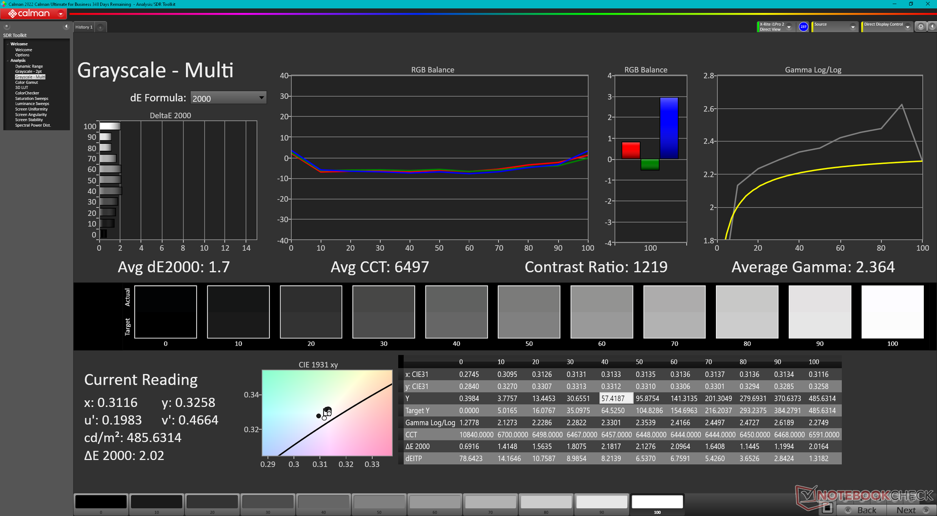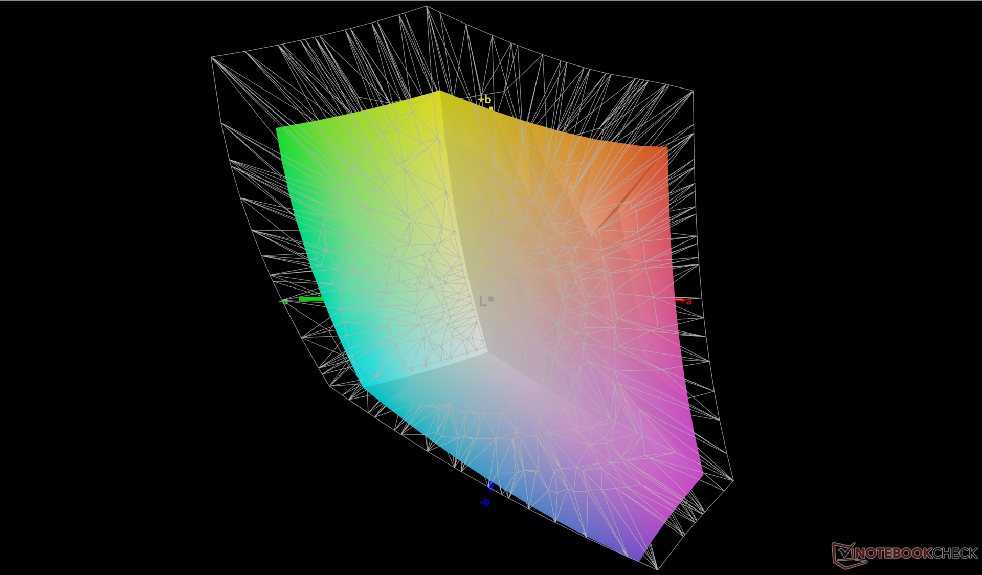 Das Display ist werkseitig bereits kalibriert mit einem durchschnittlichen DeltaE-Wert <2 je für die Graustufen und Farben. Unsere Kalibrierung verbessert den Wert für die Farben sogar auf <1, was dem Aufwand allerdings nicht gerecht wird.
