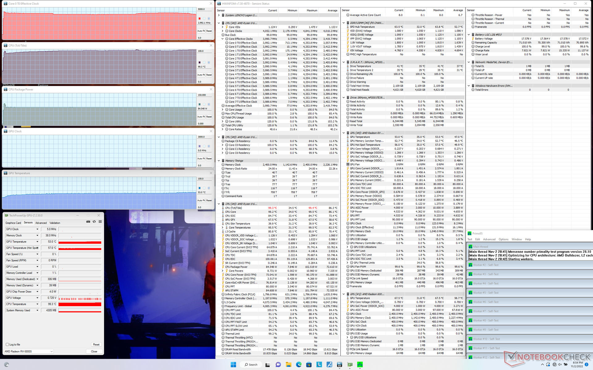 Bei alleinigem CPU-Stress (Prime95) messen wir Takte bis 4,4 GHz und eine Energieaufnahme von 103 W bei sehr hohen Kerntemperaturen von 96 °C. Kurz darauf fällt die Taktrate auf 4 GHz, zusammen mit der Energieaufnahme auf 85 W, um Kerntemperaturen von knapp unter 100 °C beizubehalten. Das größere Legion 7 16 (AMD) erreicht nur etwas kühlere Kerntemperaturen von 93 °C.