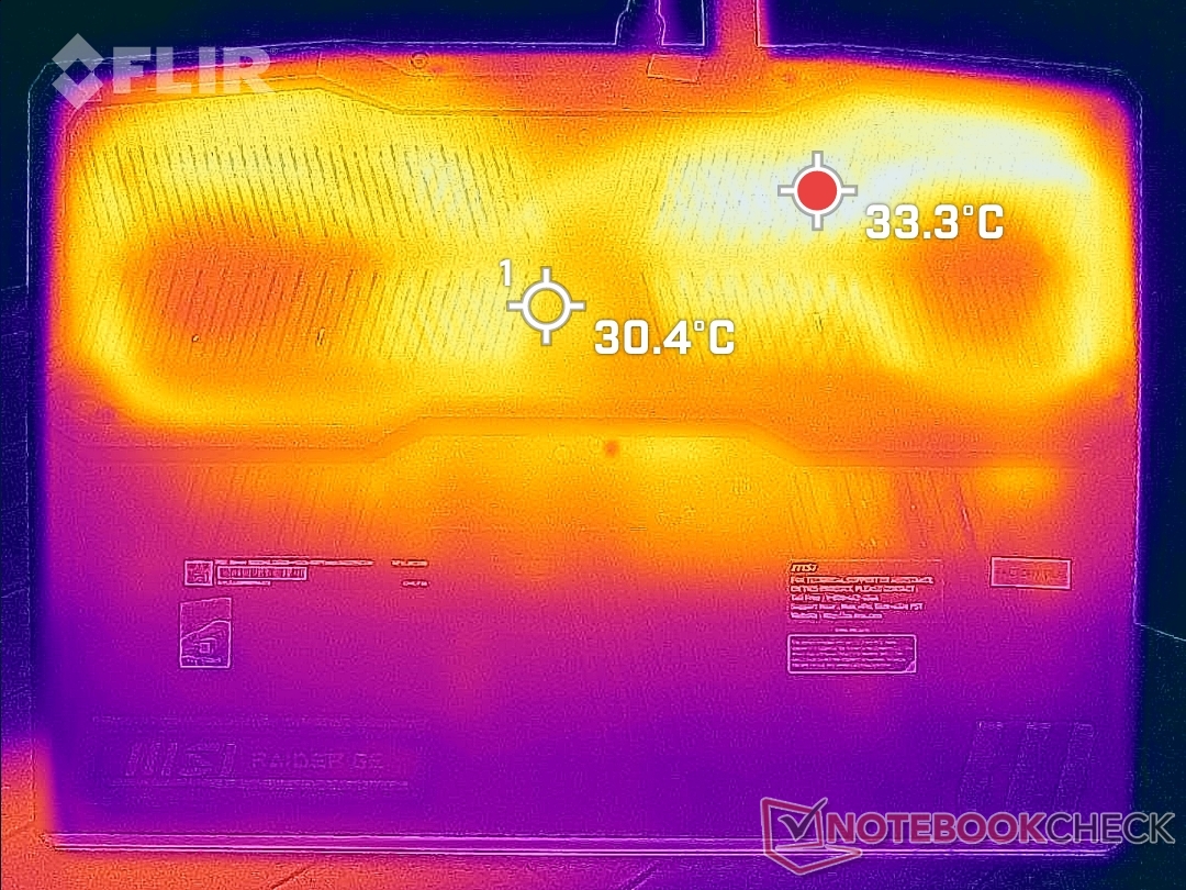 Die Oberflächentemperaturen sind kühler als beim GE66. Im Gaming-Betrieb erreichen die wärmsten Stellen auf der Tastaturfläche und der Bodenplatte 35 °C bzw. 46 °C. Die Bereiche befinden sich im hinteren Teil des Gehäuses, wie die Wärmebilder unten zeigen.