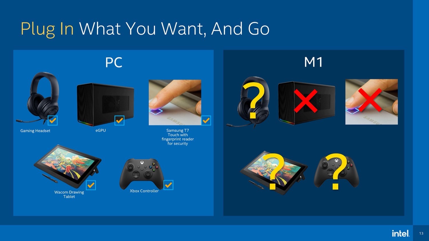 Darüber hinaus spricht Intel von diversen Kompatibilitäts-Problemen und Einschränkungen, wie etwa der Tatsache, dass das MacBook Pro auf Basis des M1 nur ein externes Display unterstützt, und dass es angeblich Probleme mit Zubehör wie externen Grafikkarten, Xbox Gamepads, Wacom Zeichentabletts und co. gibt, während spezialisierte Software wie Ableton-Plugins auf dem M1 einfach nicht laufen.