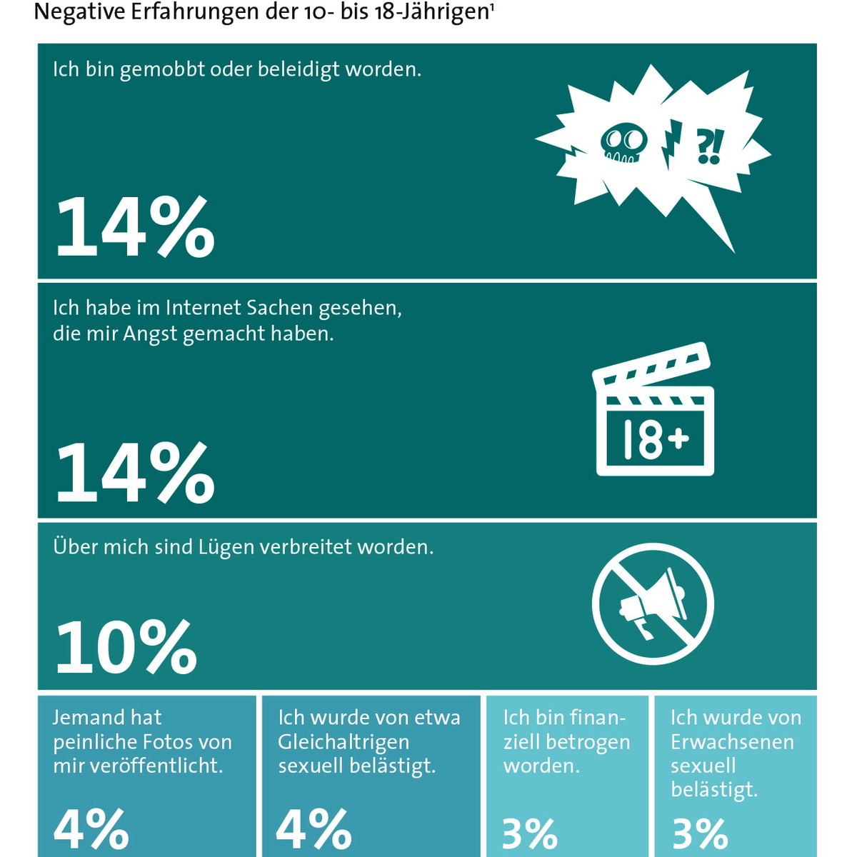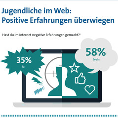 In der Umfrage gaben allerdings auch 35 Prozent der 10- bis 18-Jährigen an, bereits schlechte Erfahrungen im Internet gemacht zu haben. Der Anteil steigt mit dem Alter und der Nutzungsintensität. Unter den 10- bis 12-Jährigen haben erst 23 Prozent negative Erfahrungen im Web gemacht, unter den 13- bis 15-Jährigen ist es fast ein Drittel (32 Prozent) und unter den 16- bis 18-Jährigen bereits die Hälfte (50 Prozent).