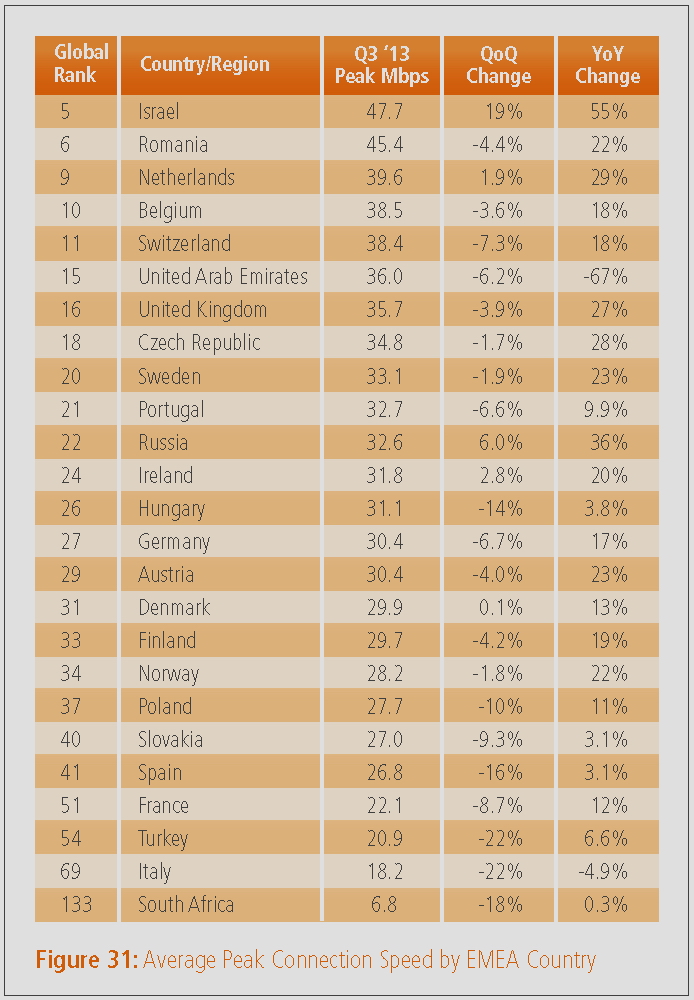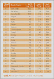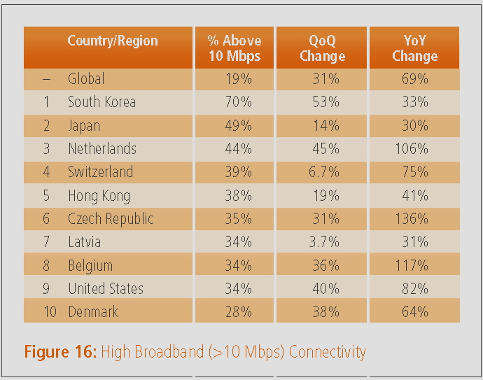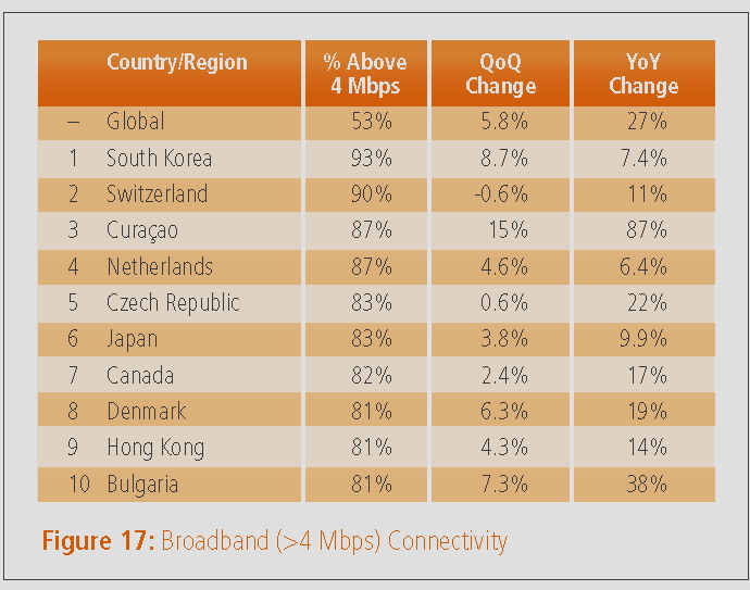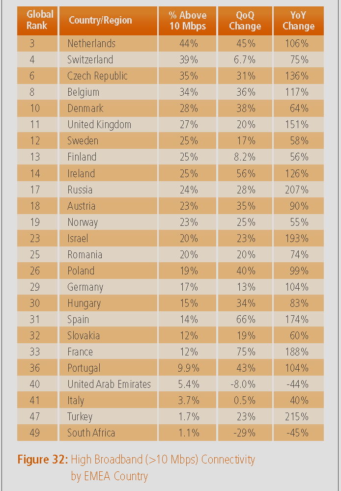 Während Deutschland bei der durchschnittlichen Verbindungsgeschwindigkeit mit 7,6 MBit/s auch in Europa weit hinten rangiert, ist das Internet in den Niederlanden, der Schweiz und der Tschechischen Republik mit mehr als 10 MBit/s besonders schnell.