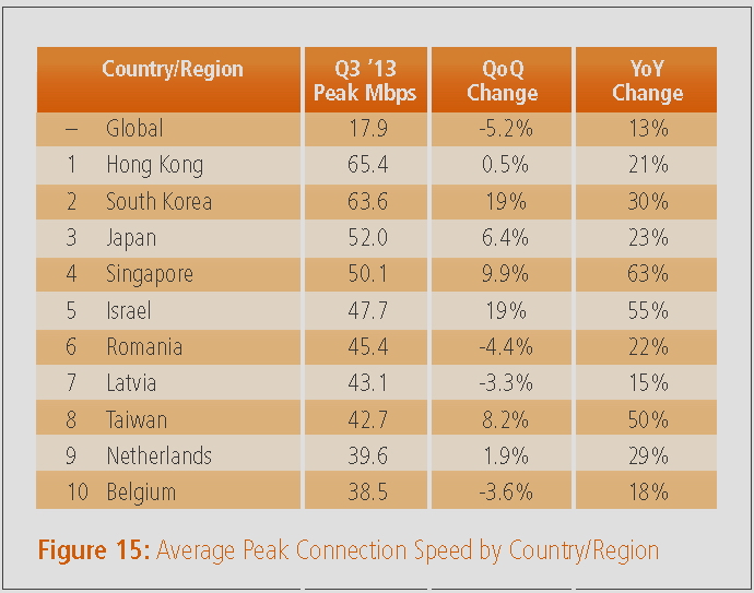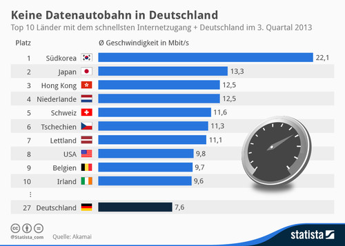 Von wegen 100 MBit/s oder mehr - in Deutschland lag die durchschnittliche Verbindungsgeschwindigkeit im 3. Quartal 2013 laut Akamai bei schlappen 7,6 Mbps. Das reichte nur noch für Platz 27. Anfang 2013 lag Deutschland noch auf Position 20.
