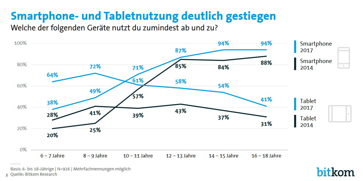 Im Jahr 2014 nutzten erst 39 Prozent der 6- bis 7-Jährigen gelegentlich das Internet. Heute tun dies mit 48 Prozent rund die Hälfte. Die Zeit, die täglich im Internet verbracht wird, ist in diesem Zeitraum ebenfalls sprunghaft gestiegen: 2014 waren dies 11 Minuten, 2017 sind es jeden Tag 39 Minuten. Bei den 8- bis 9-Jährigen zeigt sich eine ähnliche Entwicklung. Die Internetnutzung stieg von 76 auf auf 81 Prozent. Die verbrachte Zeit im Internet hat sich dabei binnen drei Jahren fast verdreifacht. Von damals 16 auf heute 43 Minuten.