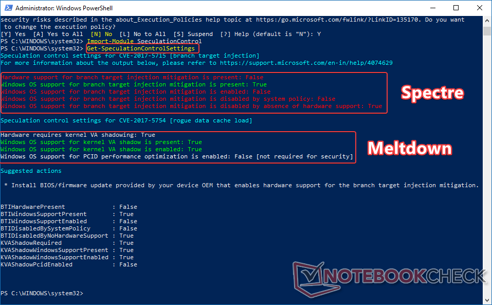 Nun führt man das PS-Skript mit dem Befehl Get-SpeculationControlSettings aus. Man sieht zwei Sektionen - eine für CVE-2017-5715 (Spectre Variante 2) und die andere für CVE-2017-5754 (Meltdown). Falls Ihr Mainboard-Hersteller bereits ein Microcode-Update für Spectre veröffentlicht hat, sind die meisten Einträge mit "True" in Grün gekennzeichnet. In diesem Fall hat Acer noch kein BIOS/UEFI-Update für den Pentium 4200 Apollo-Lake-Prozessor in dem Aspire ES1-533-Laptop veröffentlicht, weshalb alle Einträge mit "False" in Rot gekennzeichnet sind. Das Microsoft-Update für Spectre ist aber installiert, weshalb bei Windows OS "True" in Grün steht. Falls der Hersteller ein BIOS-Update bietet, sollte alle anderen Einträge ebenfalls auf "True" stehen. Es ist also nicht ganz trivial, die Risiken von Spectre abzuschwächen - es ist schwieriger auszunutzen, aber auch schwieriger zu patchen.