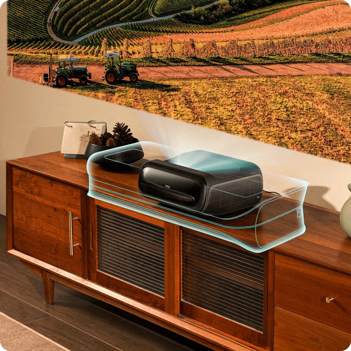 Der JMGO O2S Ultra dürfte aufmerksamen Lesern nicht komplett unbekannt sein, inzwischen ist das Modell aber auch in Deutschland erhältlich - für einen Preis von 2.999 Euro. Dabei gibt es diesen Beamer auch im Paket mit einer passenden Leinwand, es handelt sich natürlich um einen preisintensiveren Beamer. Dabei ist der JMGO O2S Ultra ein UST-Beamer, welcher dementsprechend einen nur besonders geringen Abstand zur Projektionsfläche benötigt, das Projektionsverhältnis wird mit nur 0.16:1 angegeben, typisch für solche UST-Beamer ist ein Projektionsverhältnis von 0.25:1. In einem Abstand von nur 16,8 Zentimetern soll sich schon eine Projektion mit einer Diagonalen von 100 Zoll realisieren lassen, dementsprechend muss der JMGO O2S Ultra im Regelfall nicht aufwendig installiert werden, sondern kann einfach auf einer TV-Bank abgelegt werden.