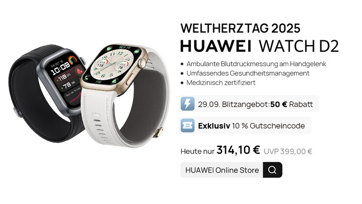 Zum Weltherztag gibt es die HUAWEI WATCH D2 zum besonders günstigen Preis. Nur heute am 29. September 2025 und morgen am 30.9. gibt es die Smartwatch im HUAWEI Onlineshop im Flash-Sale dank 50 Euro Rabatt für nur 349 Euro (statt 399 Euro UVP). Hierfür ist keinerlei Code erforderlich.