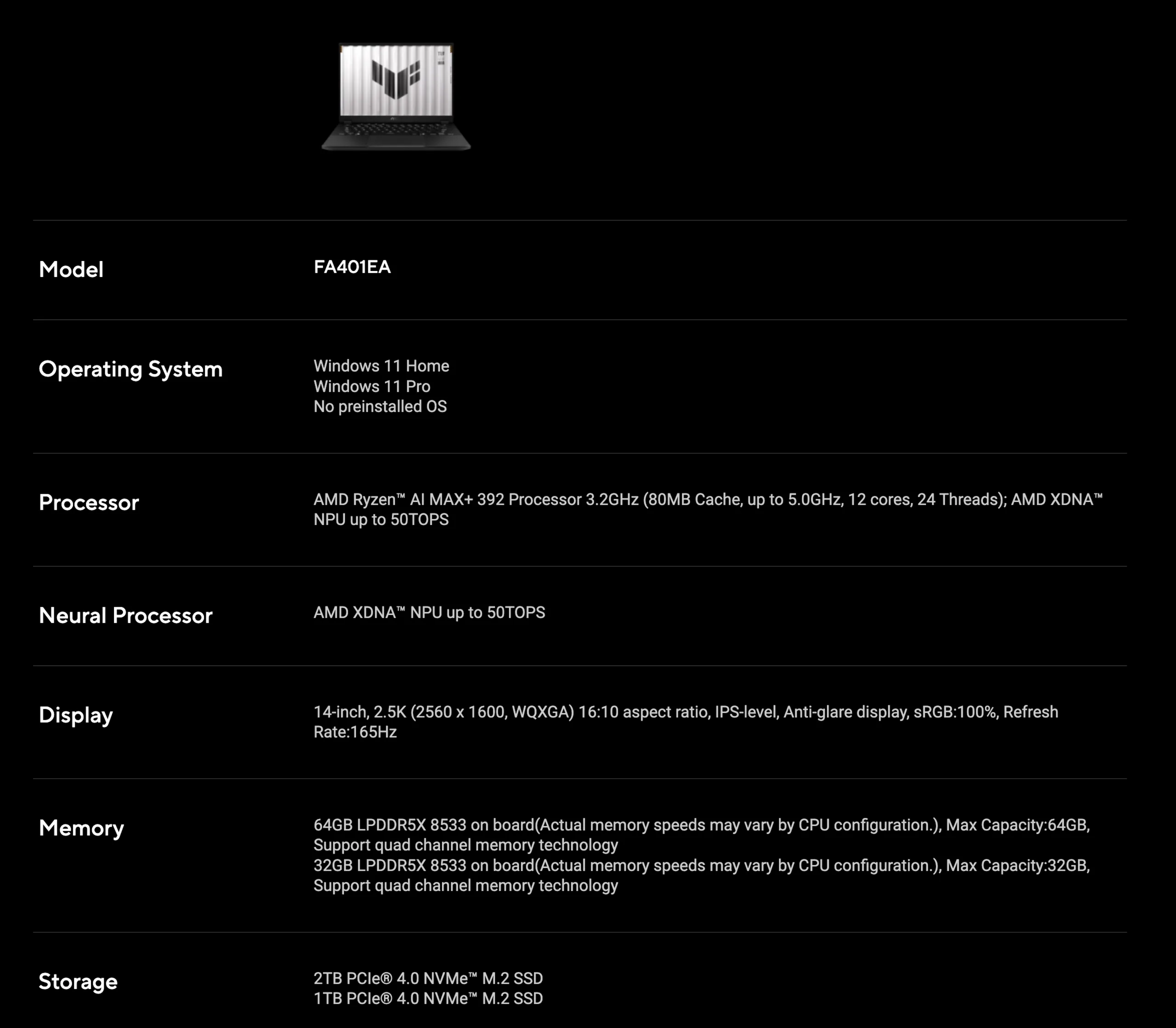 Als die interessantere der beiden Ausführungen gilt wohl die Modellnummer FA401EA, die das Upgrade auf AMD Strip Halo noch vor dem höherpreisigen Asus ROG Zephyrus G14 bekommen hat. Konkret kommt hier der AMD Ryzen AI Max+ 392 zum Einsatz, den AMD während der CES 2026 vorgestellt hat. Diese CPU hat 12 Kerne, 24 Threads und eine integrierte Radeon 8060S Grafikeinheit. Zwar fällt die CPU-Leistung geringer aus als beim AMD Ryzen AI Max+ 395 im Asus ROG Flow Z13, bei der Grafikleistung dürfte das Asus TUF Gaming A14 jedoch mit dem 2-in-1-Modell gleichziehen.